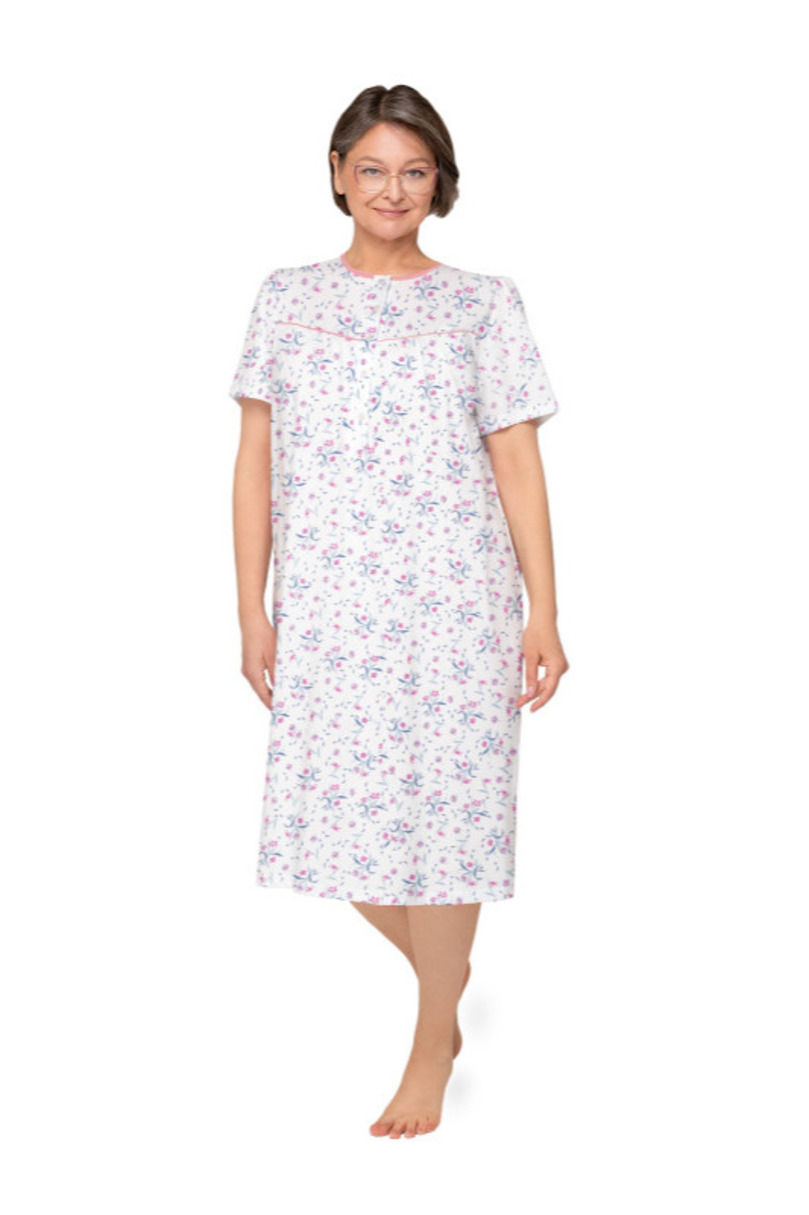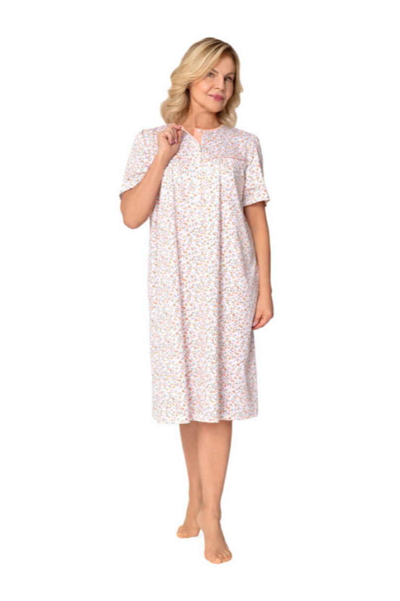 Жіноча сорочка з коротким рукавом з ніжної бавовни з малюнком і цифровим друком. Виріз на блискавці, зібраний на грудях, довжина сорочки нижче коліна. Склад: 100% бавовна