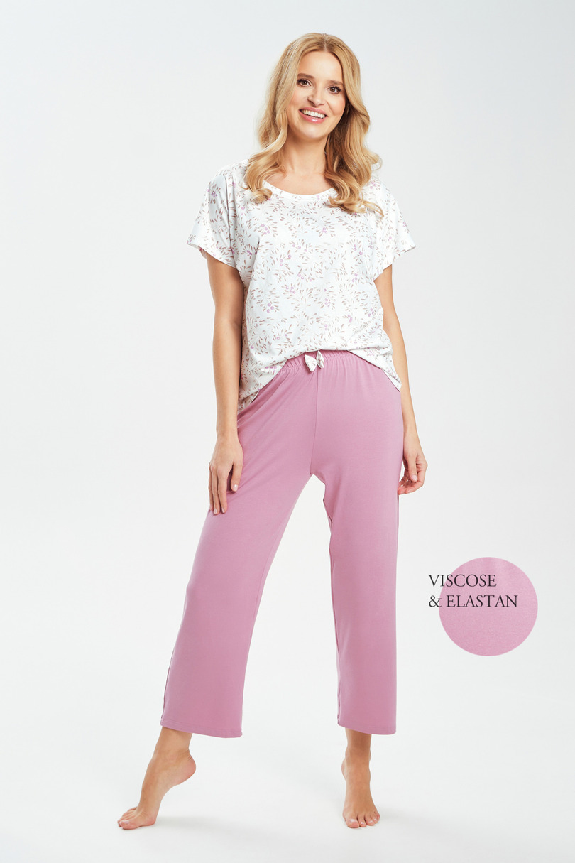 Жіноча піжама 3542 MARIELLA S-XL TARO – це елегантний та зручний комплект нічного одягу, що поєднує натуральну бавовну та ніжну віскозу. Футболка з короткими рукавами, виготовлена зі 100% дихаючої бавовни, забезпечує комфорт та приємне носіння протягом усієї ночі. Прикрашена ніжним ботанічним принтом та має круглий виріз горловини, що додає їй жіночності. Однотонні штани довжиною 7/8, виготовлені з м’якої, еластичної віскози (93% віскози, 7% еластану), ідеально облягають фігуру та гарантують свободу рухів. Зручний еластичний пояс з декоративним бантом підкреслює ніжний стиль комплекту. Піжама упакована в поліетиленовий пакет – ідеально підходить як для сну, так і для відпочинку вдома.