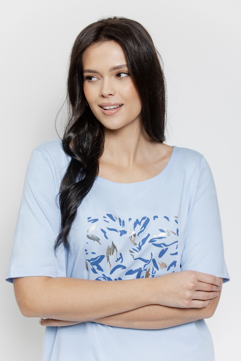 Жіноча нічна сорочка VALENTINA 3572 розмірів 2XL–3XL поєднує в собі комфорт, жіночний стиль та натуральні матеріали, створені для комфортного сну та відпочинку вдома. Виготовлена зі 100% високоякісної бавовни, вона м'яка, дихаюча та приємна для шкіри. Маючи круглий виріз горловини та короткі рукави, вона ідеально підходить для носіння цілий рік, навіть у теплі ночі. Декоративний, ледь мерехтливий принт спереду додає елегантності та тонко підкреслює жіночний характер дизайну. Модель до коліна забезпечує комфорт та свободу рухів, а невеликі розрізи по низу підвищують зручність носіння та тонко підкреслюють силует. Вільний, розслаблений крій робить нічну сорочку VALENTINA ідеальною для великих розмірів. Вона постачається в практичному пластиковому пакеті.