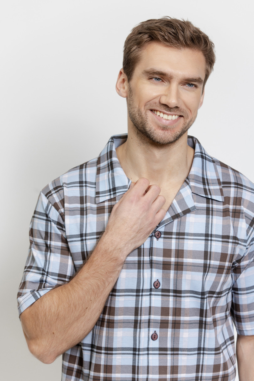 Чоловіча піжама 3579 ALEXANDER TARO – це класичний та зручний комплект нічного одягу для чоловіків, які цінують комфорт та позачасовий стиль. Доступна в розмірах від M до 2XL, ця модель ідеально підходить як для сну, так і для відпочинку вдома. Сорочка з короткими рукавами на ґудзиках має елегантний картатий візерунок, що надає їй стильного, традиційного вигляду. Комір та практичні кишені підкреслюють класичний дизайн, а вільний крій забезпечує свободу рухів та комфорт. Однотонні штани прямого крою ідеально доповнюють верх. Зручний еластичний пояс забезпечує щільне прилягання без відчуття стягнутості. М'яка, приємна для шкіри тканина забезпечує комфорт протягом усієї ночі. Піжама ALEXANDER 3579 від TARO – чудовий вибір для чоловіків, які шукають високоякісну, зручну та стильну піжаму на будь-який сезон.