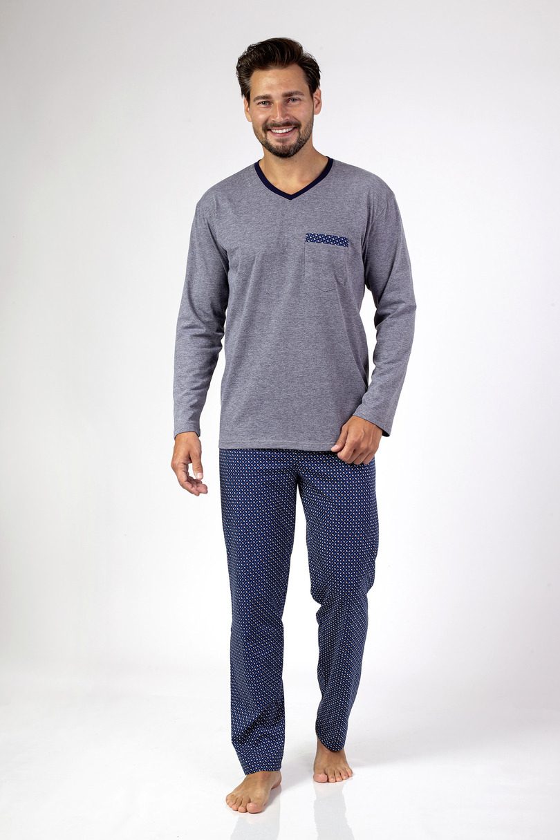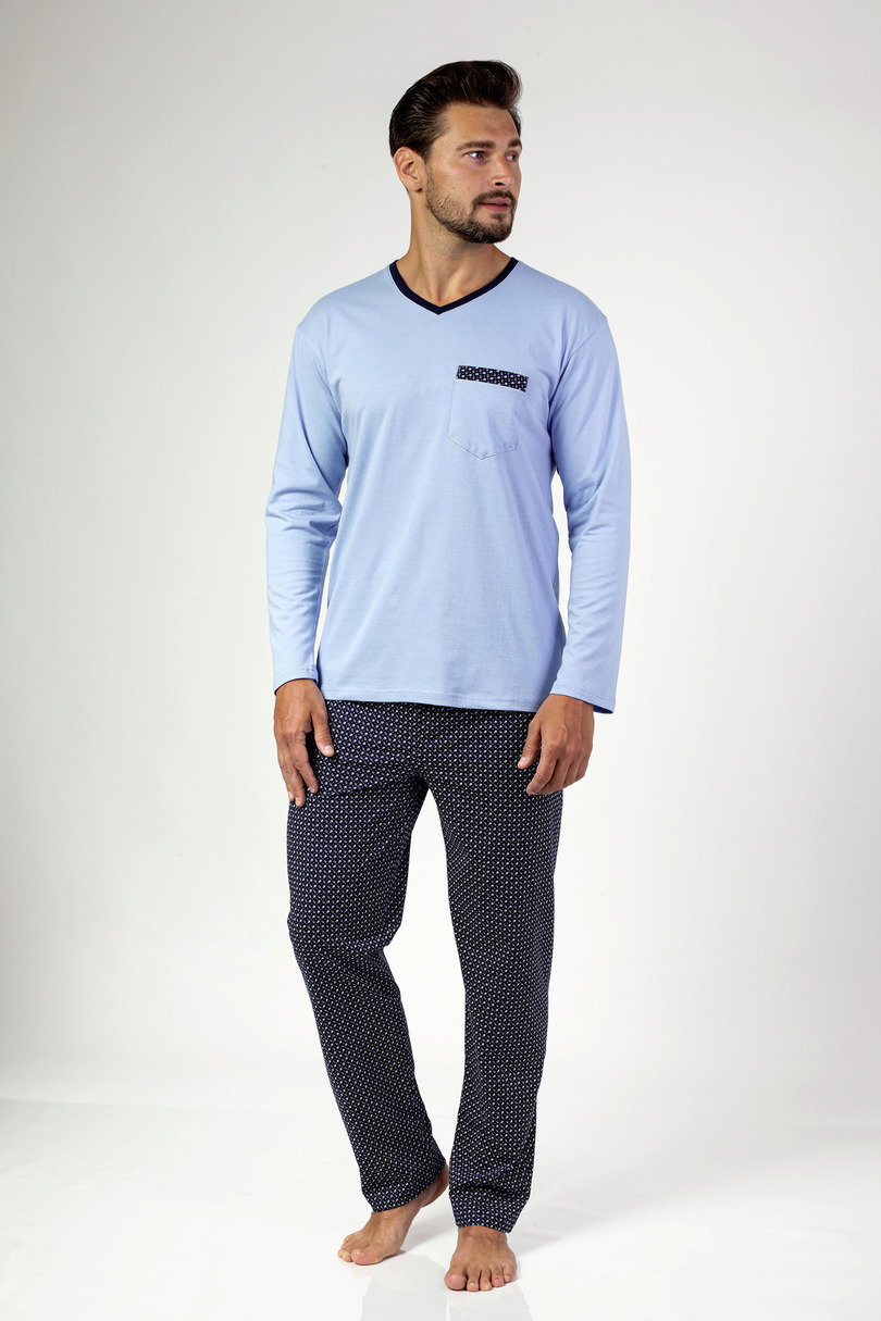 Класична чоловіча піжама з довгим рукавом з високоякісної бавовни. Гладка футболка з V-подібним вирізом і кишенею на рівні грудей. У комплект входять штани з малюнком довгі штани. Склад: 100% бавовна