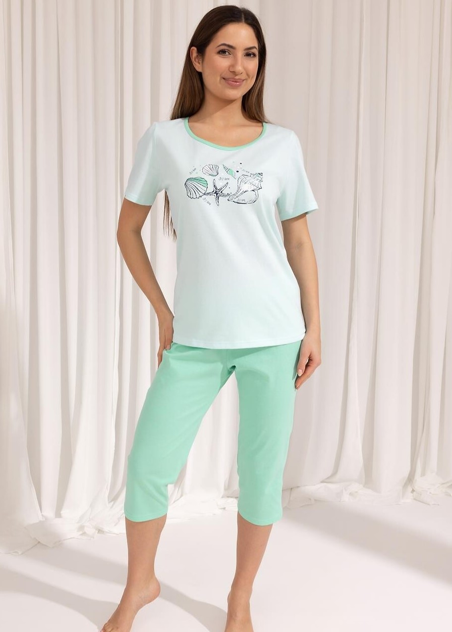 Жіноча піжама з короткими рукавами, круглим вирізом, спереду прикрашена ніжним принтом. Однотонні брюки довжиною 3/4 доповнять комплект. Склад: 100% бавовна