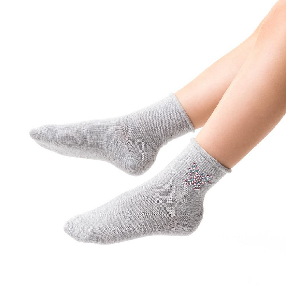 Однотонні бавовняні шкарпетки для дівчаток, прикрашені кришталевою аплікацією навколо щиколотки. Надзвичайно зручний і м'який. Знімач без тиску. Склад: бавовна 73%, поліамід 23%, еластан 4%.