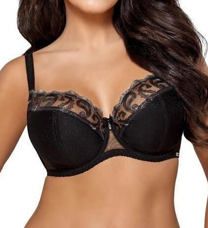 Бюстгальтер з напівжорсткими чашками з тонкої сітки, прикрашений красивою вишивкою - на їх з'єднанні атласний бант з ювелірним елементом. Внутрішня сторона підбита ніжним бавовною. Бічні сторони з гладкої тканини, посиленої вертикальною підкладкою.
