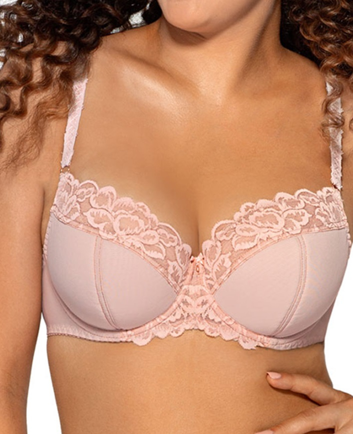 Бюстгальтер з напівпідкладкою, чашки з гладкою сіткою, верхня лінія прикрашена мереживом. По колу виконана з еластичної тканини, що не розтягується. Незнімні регульовані бретелі. Склад: 88% поліамід, 8% бавовна, 4% еластан.