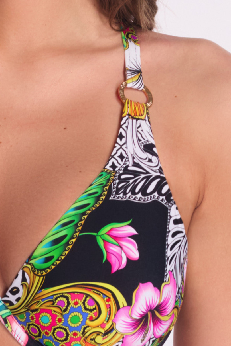 Купальник SK 239 Royal Wild від AVA Swimwear поєднує сміливий дизайн з жіночною витонченістю. М'які чашечки на контурній дроті забезпечують природну форму грудей, одночасно дбайливо моделюючи та піднімаючи. Низька, заокруглена перенісся піднімає груди вгору та візуально зближує їх, створюючи привабливе декольте без ефекту пуш-ап. Бретелі утворюють ефектний хрест ззаду, рівномірно розподіляючи вагу та підвищуючи комфорт, а шнурівка забезпечує ідеальну посадку. Яскравий принт поєднує екзотичні квіти, листя та геометричні візерунки, чудово підкреслюючи літню засмагу. Золоті деталі додають розкішного штриха. Ця модель ідеально підходить для літа – для жінок, які люблять поєднувати моду, функціональність та чуттєвість. Склад матеріалу: 80% поліамід, 20% еластан