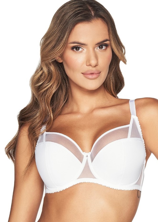 Напівпідкладений бюстгальтер з фатину та трикотажу. Бічна панель збирає груди, а бретельки, посилені піною, запобігають тиску на плечі. Триступеневе кріплення на широкий гачок. Склад: 60% поліамід, 20% еластан, 17% поліестер, 3% бавовна.