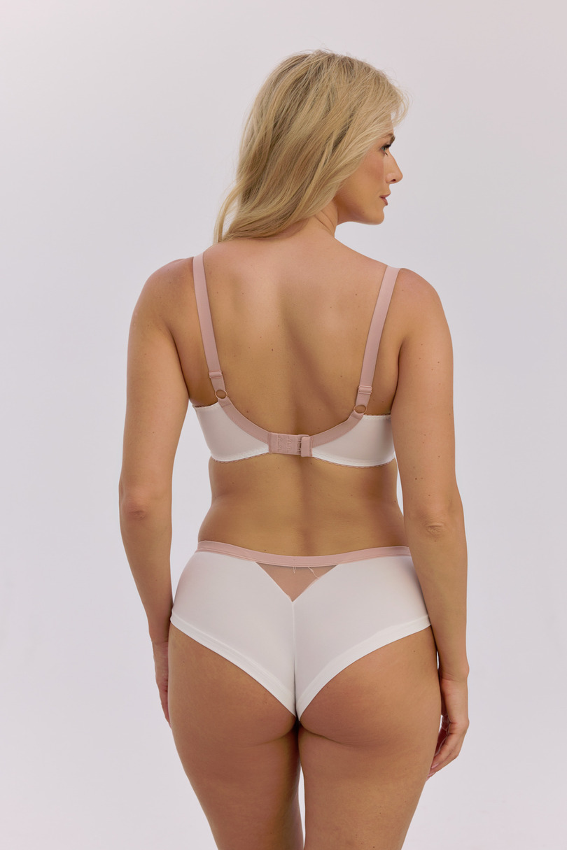 Бюстгальтер Soft Yesenia Art. 1353 – це квінтесенція витонченості та жіночної елегантності. Виготовлений з щільного ажурного мережива ніжного відтінку мокко, він полонить своїм вигадливим візерунком та м’яким покриттям. М’яка конструкція без підкладки забезпечує природне положення грудей, водночас забезпечуючи чудову підтримку завдяки кісточкам та точному крою. Прозора верхня чашка додає легкості, а чарівний бант з декоративною деталлю на переніссі підкреслює романтичний характер білизни. Ця модель ідеально підходить для жінок, які цінують витонченість, комфорт та стиль. 50% поліестер, 40% поліамід, 10% еластан