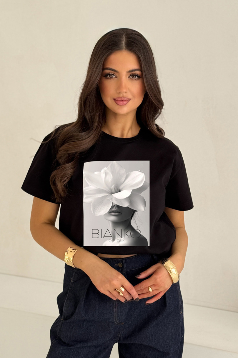 Ця жіноча футболка з великим принтом – модний та зручний варіант для щоденного носіння. Її простий, вільний крій забезпечує свободу рухів та комфорт протягом усього дня. Яскравий принт надає футболці сучасного вигляду та ідеально відповідає сучасним тенденціям. Виготовлена з високоякісної бавовни (95% та 5% еластану), ця тканина м’яка та приємна на дотик, що робить її ідеальною як для повсякденного, так і для спортивного стилю. Ця жіноча футболка з принтом ідеально поєднується з джинсами, легінсами, шортами або спідницею, створюючи зручний та стильний образ для будь-якої нагоди.