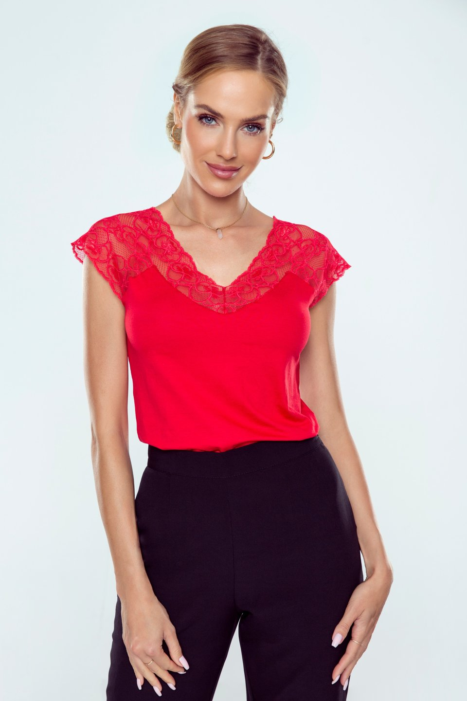 Блуза виконана з поєднання красивого мережива та віскози. Глибокий V-подібний виріз ззаду і спереду. Мереживні рукава, плечі та декольте. Склад: віскоза 85%, поліамід 10%, еластан 5%.