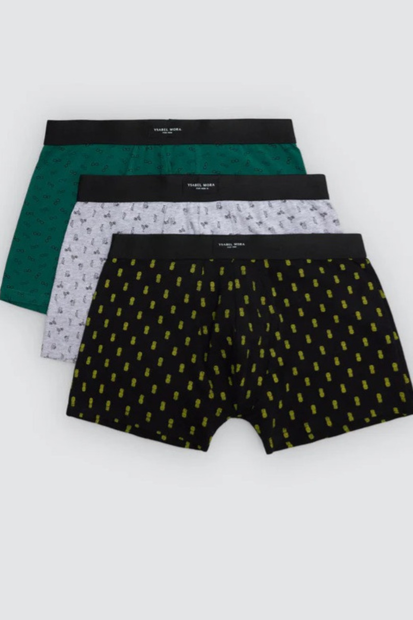 Чоловічі боксерки Ysabel Mora з цього комплекту з трьох предметів – ідеальне поєднання комфорту, якості та сучасного стилю. Ці чоловічі боксерки вирізняються модними принтами та ретельною майстерністю виготовлення, що забезпечує комфорт під час щоденного носіння. Виготовлені з м’якої, дихаючої бавовни з додаванням еластичних волокон, вони ідеально сидять на фігурі та забезпечують повну свободу рухів. Матеріал приємний до шкіри та ідеально підходить як для щоденного, так і для активного носіння. Еластичний пояс з логотипом Ysabel Mora гарантує надійну посадку без відчуття тісноти. Комплект включає три пари боксерів різних кольорів та візерунків, що надає білизні сучасного та унікального характеру. Цей практичний вибір ідеально підходить для чоловіків, які цінують комфорт, хорошу якість та стильну повсякденну білизну. 95% бавовна, 5% еластан