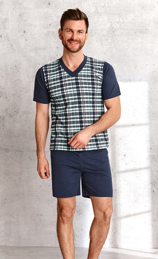 Чоловіча піжама з високоякісної бавовни. Футболка в клітку з короткими рівномірними рукавами. У комплект входять короткі шорти. Склад: 100% бавовна.