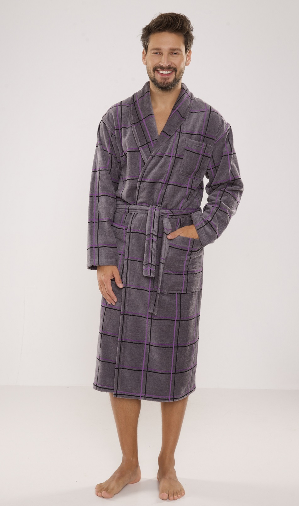 Чоловічий махровий халат з коміром, виготовлений з високоякісної бавовни. Кишені на стегнах і грудях, зав'язуються на талії. Якісна махрова тканина - зовнішній відрізаний шар, оксамитовий на дотик, внутрішній петлеподібний шар, який вбирає вологу. Склад: 100% бавовна.