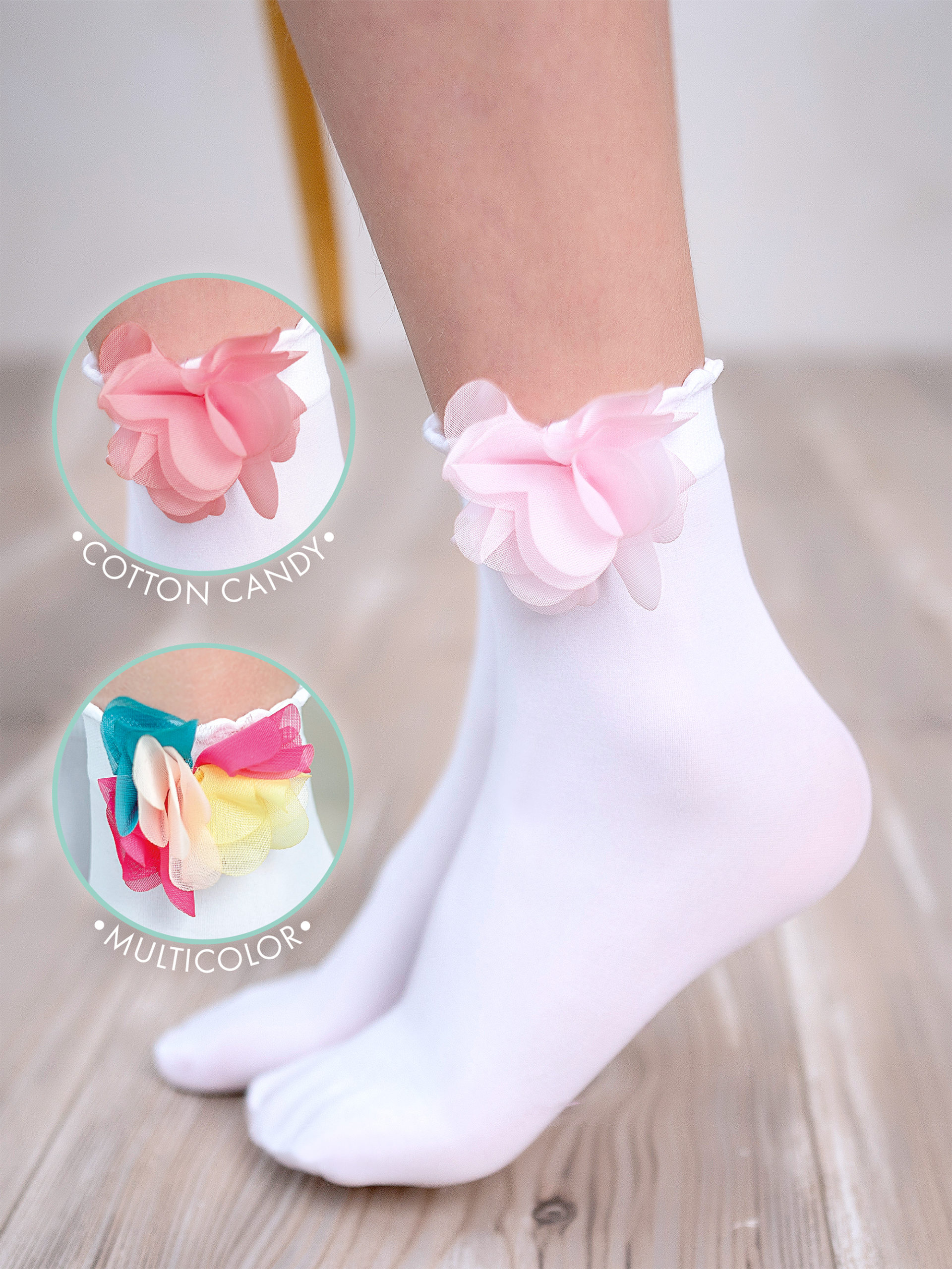 Шкарпетки для дівчаток з пришитою квітковою аплікацією. Ідеально підходить для весняних та літніх днів. Ніжна рожева квітка пришита до кольору біанко, багатоколірна квітка до кольору bianco-multi.