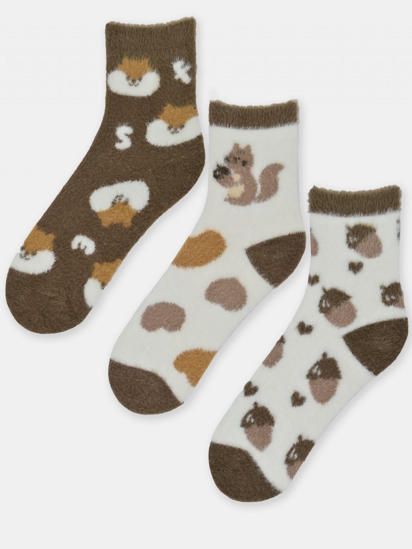 Шкарпетки для дівчинки виготовлені з м'якого трикотажу в поєднанні з ворсистою ниткою. Прикрашена візерунком білочки або жолудя. Ідеально підходить для холодних вечорів. Склад: 86% поліамід, 12% поліестер, 2% еластан
