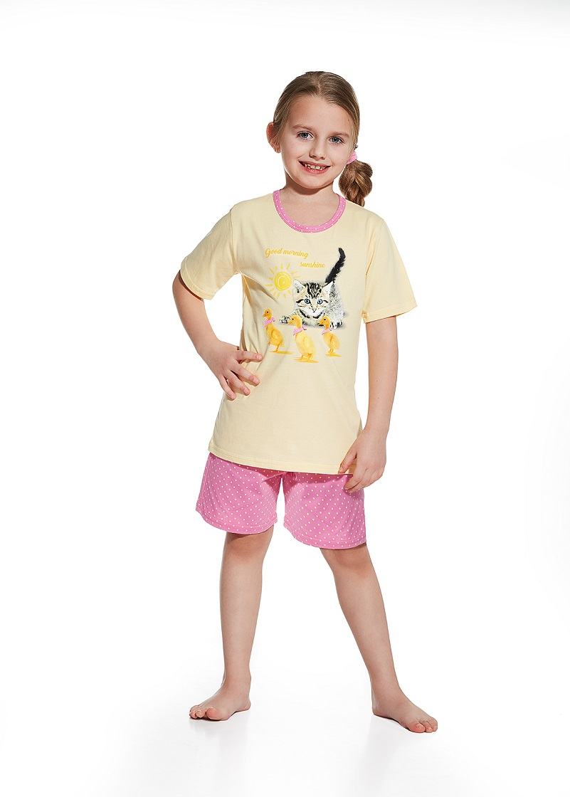 Зручна піжама для дівчинки з якісної, надзвичайно приємної та м'якої 100% бавовни. Футболка з коротким рукавом, прикрашена кольоровим принтом. Шорти. Широкий зручний еластичний пояс. Упаковано в коробку.