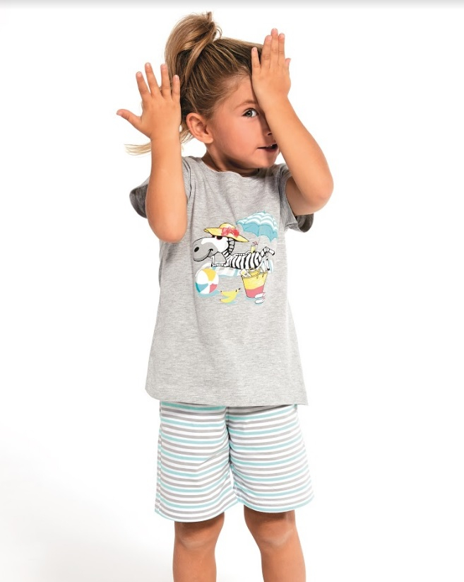 Піжама для дівчинки з високоякісної бавовни. Футболка з коротким рукавом, прикрашена кольоровим принтом. Вільні зручні шорти в смужку. Упакований в коробку. Склад: футболка 92% бавовна, 8% поліестер; шорти 100% бавовна.