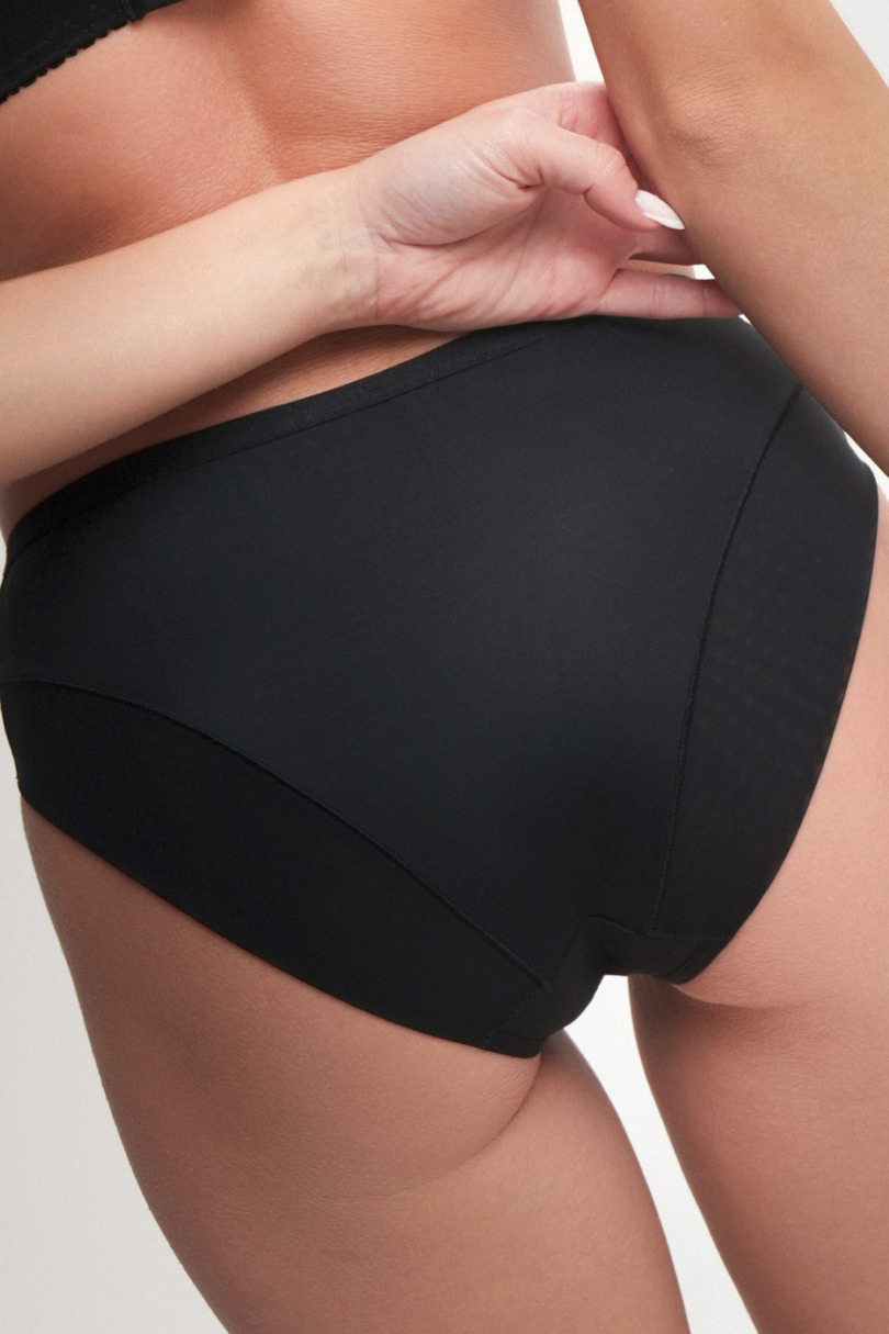 Ці пишні, гладкі трусики з декоративною сіткою з боків – ідеальне поєднання класичної елегантності, комфорту та сучасного дизайну. Ця позачасова чорна модель була розроблена для жінок, які цінують комфорт та естетично привабливу білизну. Високий виріз горловини забезпечує краще покриття та комфорт, водночас м’яко моделюючи фігуру. Гладкий, еластичний матеріал ідеально прилягає до тіла, не тиснучи та не будучи помітним під одягом. Прозорі вставки з тонкої сітки з боків додають легкості та жіночності, створюючи гармонійне поєднання класичного та чуттєвого стилю. Ці пишні чорні трусики з сіткою ідеально підходять як для щоденного носіння, так і для елегантного комплекту білизни. Ця модель поєднує функціональність з позачасовим стилем. Склад: 91% поліамід, 5% бавовна, 4% еластан