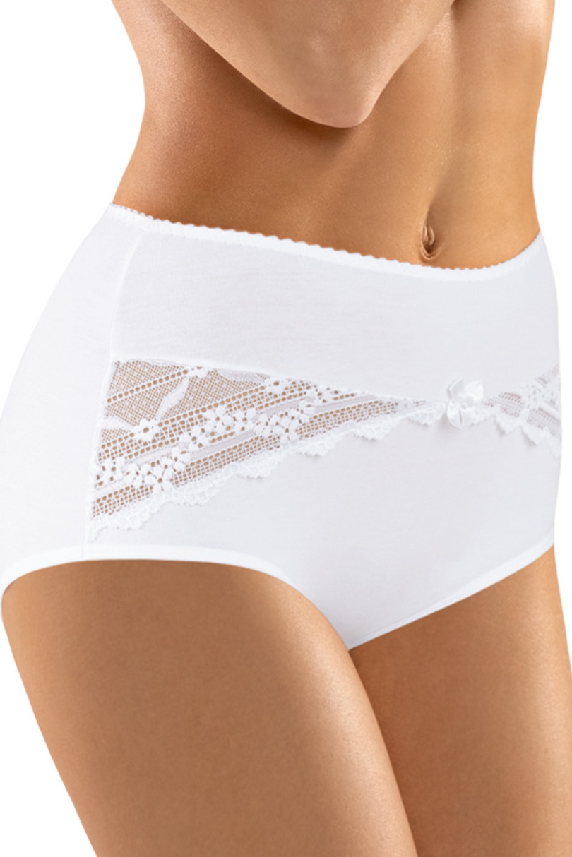 Жіночі трусики з високою талією, виготовлені з високоякісного бавовняного трикотажу з додаванням лайкри. Виріз спереду, прикрашений невеликим бантом та мереживними вставками, надає виробу справді жіночного вигляду. Склад: 92% бавовна, 8% еластан, лайкра.