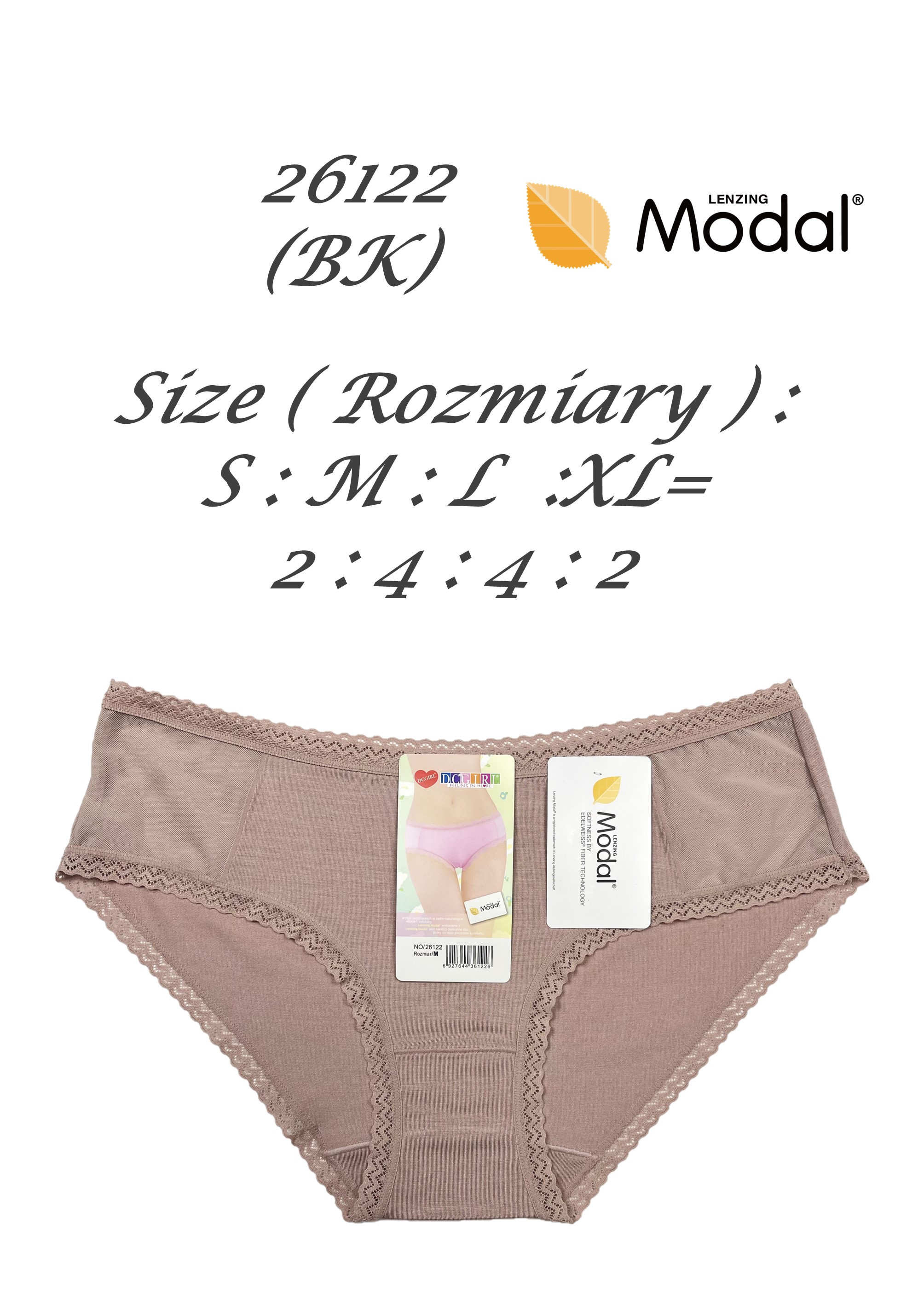 Жіночі трусики-бікіні з м'якої, зручної тканини. Декоровані ніжним мереживом. Упаковка з 12 шт. у різних кольорах. Різні розміри (S, M, L, XL) в упаковці. Склад: 94% модал, 6% еластан.