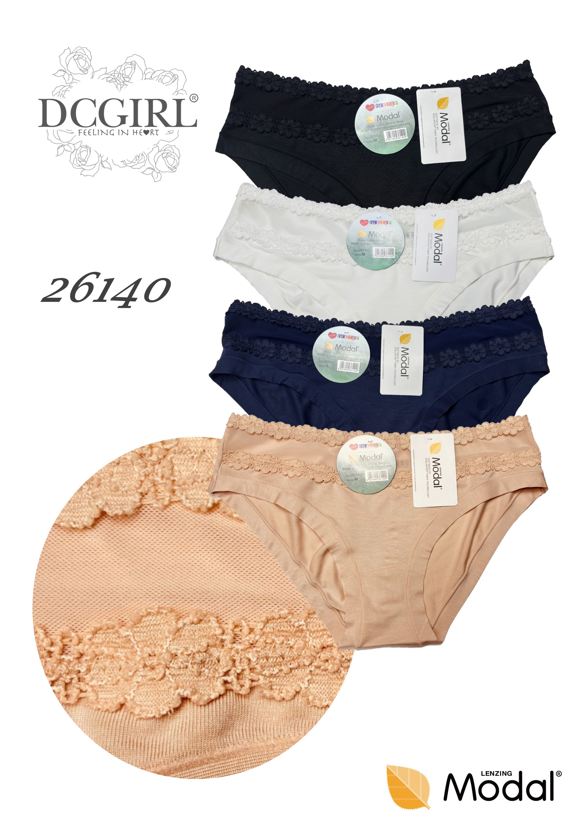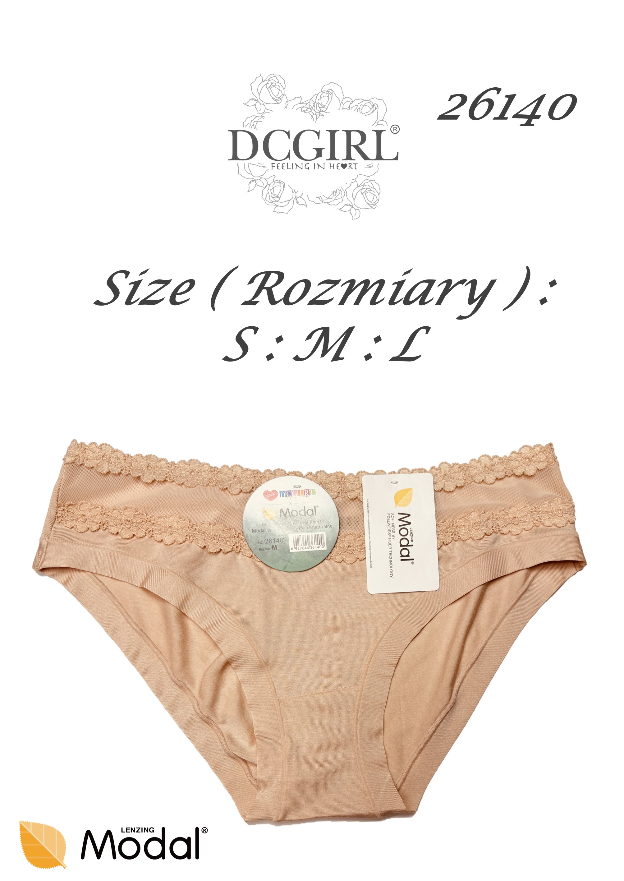 Жіночі труси з високоякісного модалу. Декоровані ніжною вставкою спереду. Надзвичайно м'які та приємні на дотик. Упаковані в упаковки по 12 штук у міксі кольорів та розмірів (S, M, L, XL). Склад: 94% модал, 6% еластан.