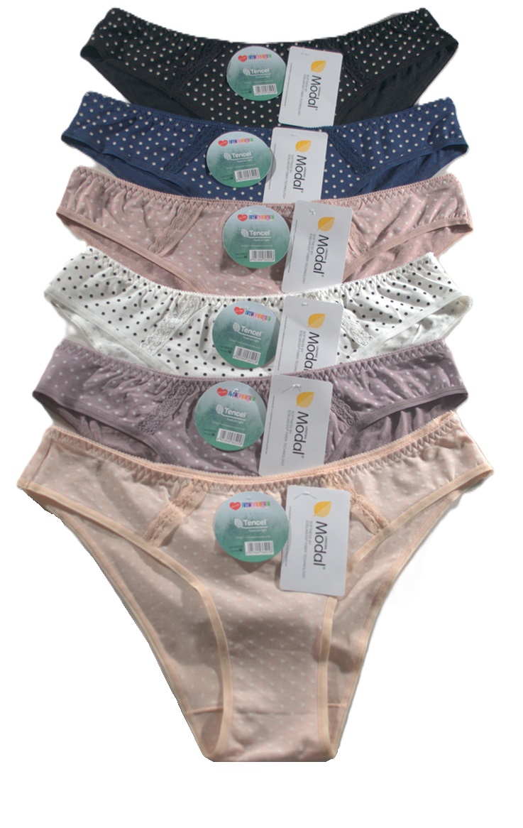Жіночі трусики з ніжного модалу в дрібний горошок. Упаковка з 12 шт. у міксі кольорів. Розміри в упаковці (S, M, L). Склад: 94% модал, 6% еластан.