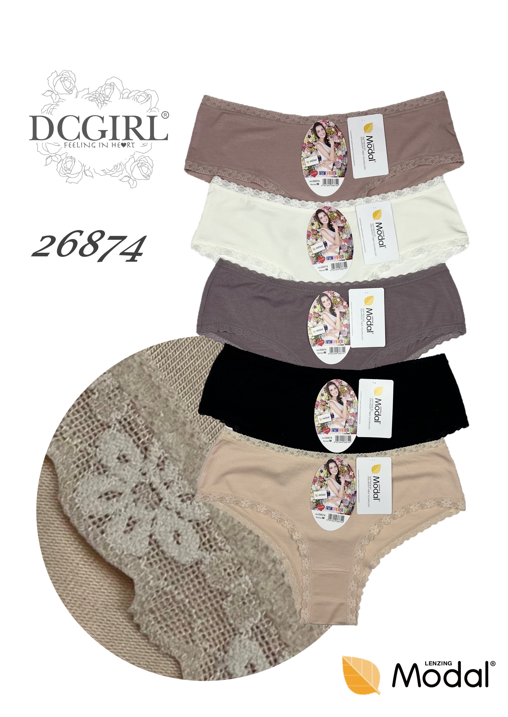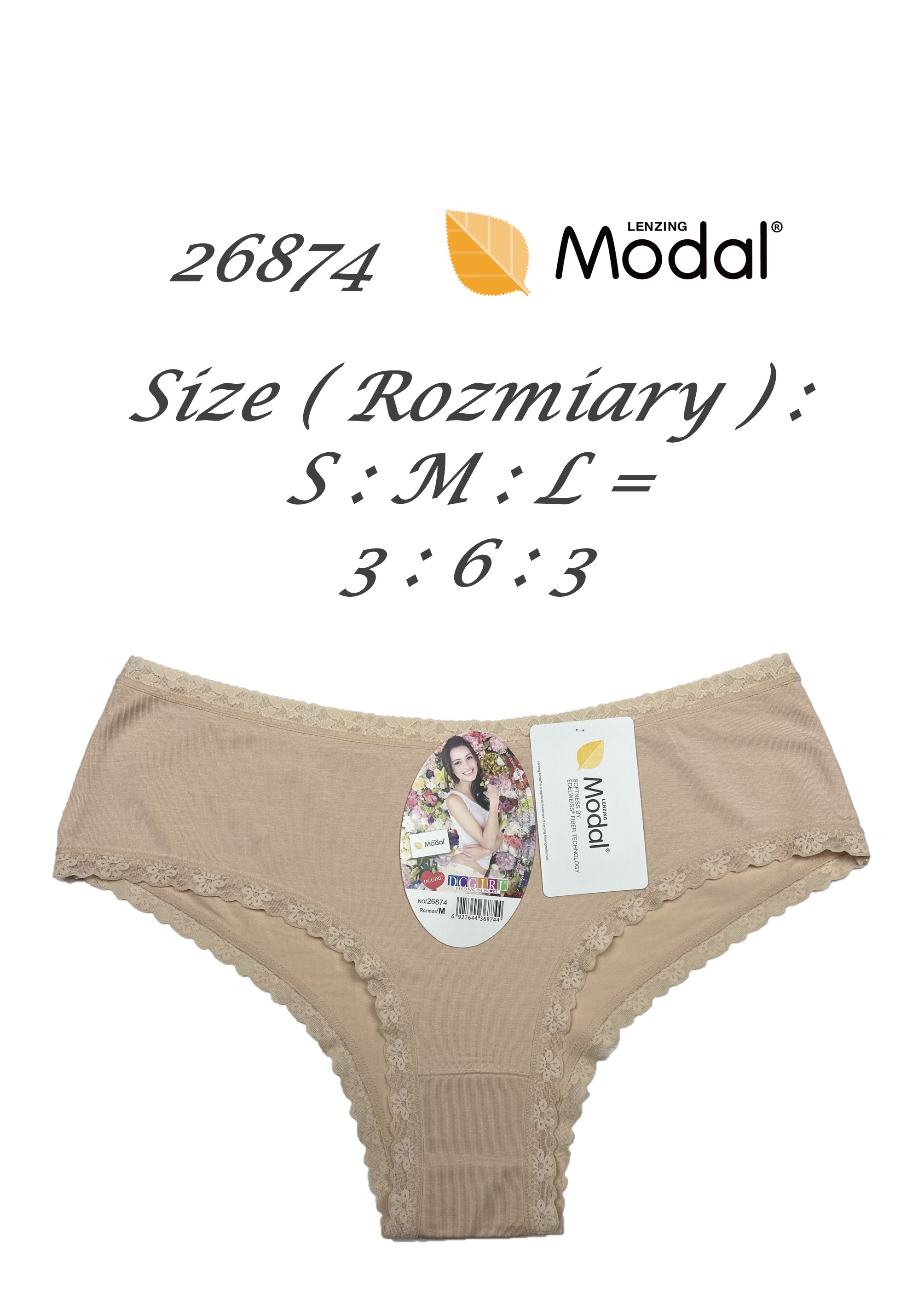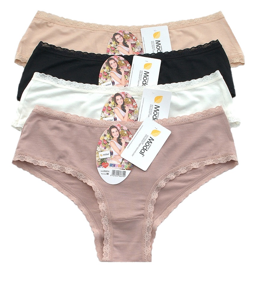 Жіночі труси з високоякісного модалу. Декоровані ніжним мереживом. Надзвичайно м'які та приємні на дотик. Упаковані в упаковки по 12 штук у міксі кольорів та розмірів. Склад: 94% модал, 6% еластан.