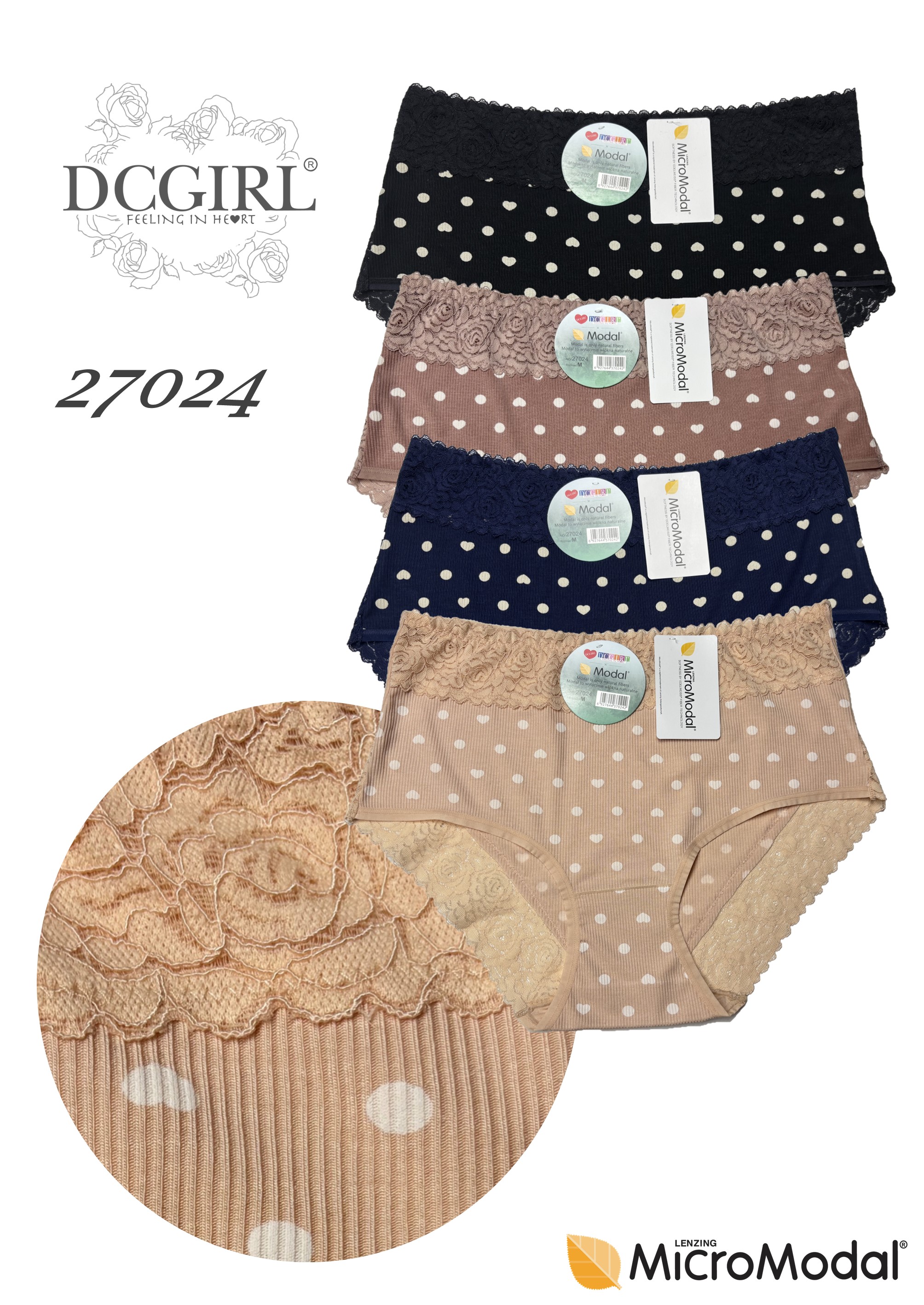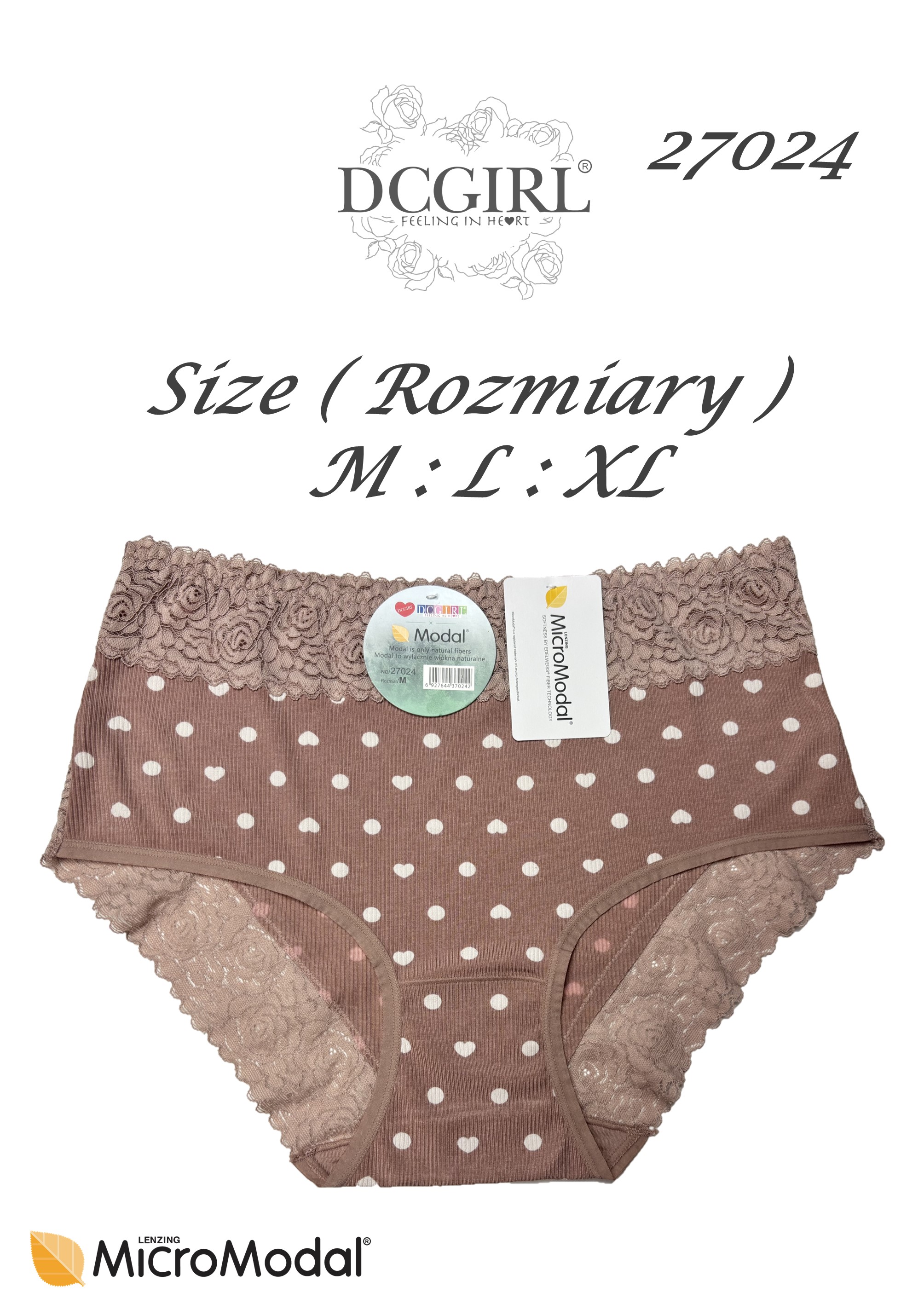 Жіночі труси з високоякісного модалу з ніжними сердечками та цяточками. Декоровані ніжною квітковою вставкою спереду. Надзвичайно м'які та приємні на дотик. Упаковані в упаковки по 12 штук у міксі кольорів та розмірів (M, L, XL). Склад: 85,5% модал, 10,5% еластан.
