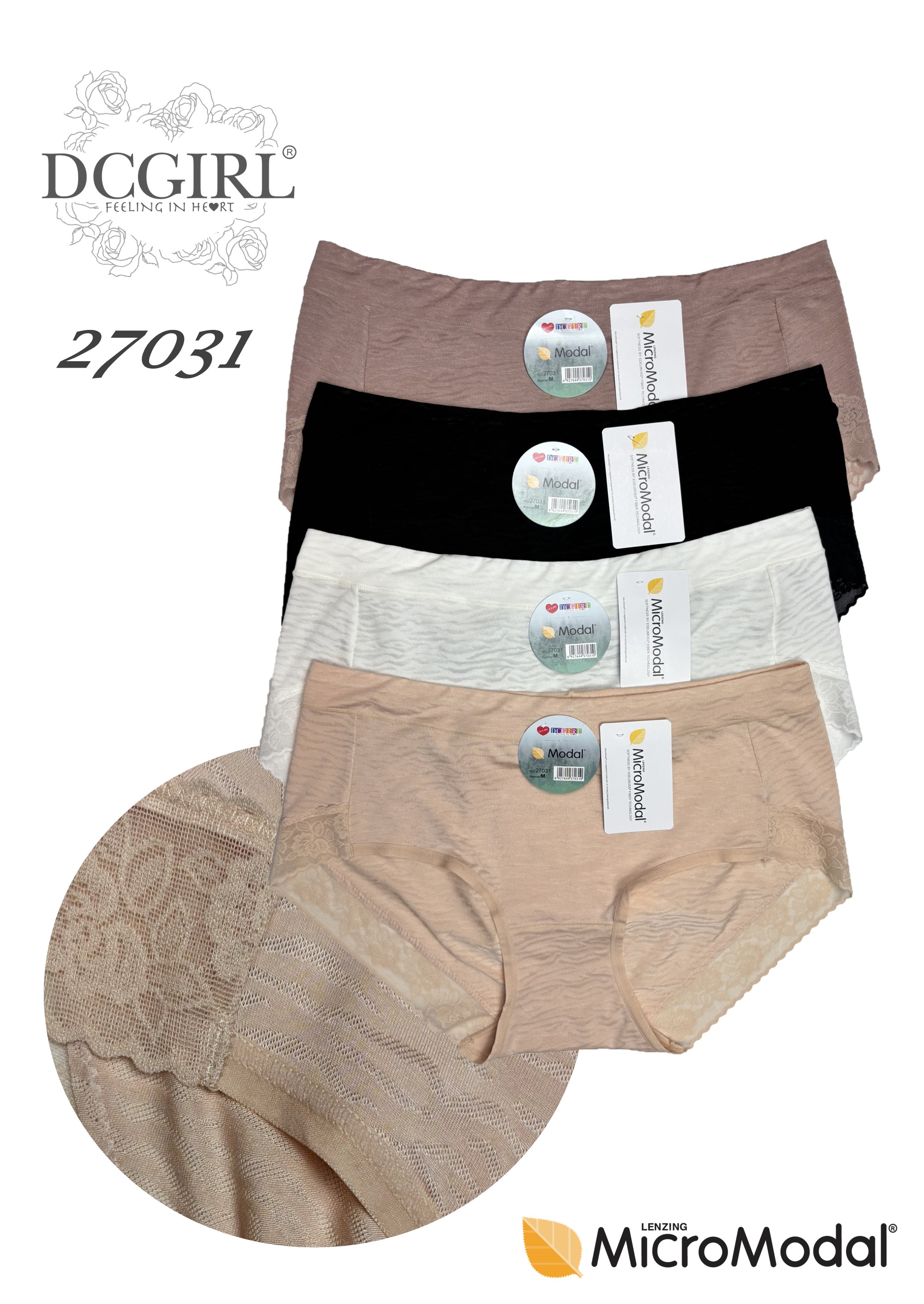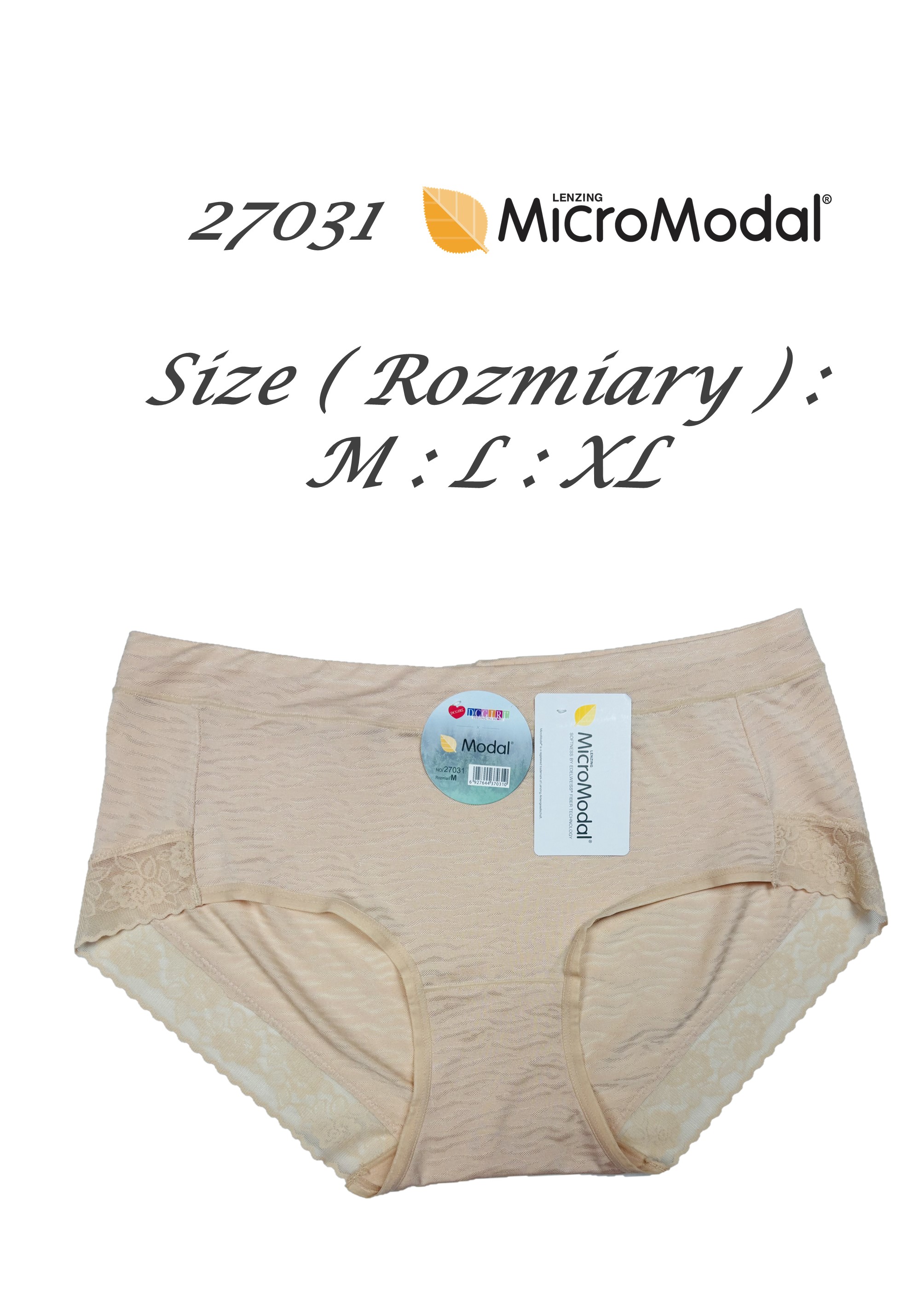 Жіночі труси з приємного для шкіри мікромодалу, з повним вирізом та закритими боками. Мереживна обробка ззаду штанин забезпечує ідеальну посадку. Доступні в упаковках по 12 штук у різних кольорах та розмірах (M, L, XL). Склад: 89,5% модал, 10,5% спандекс.