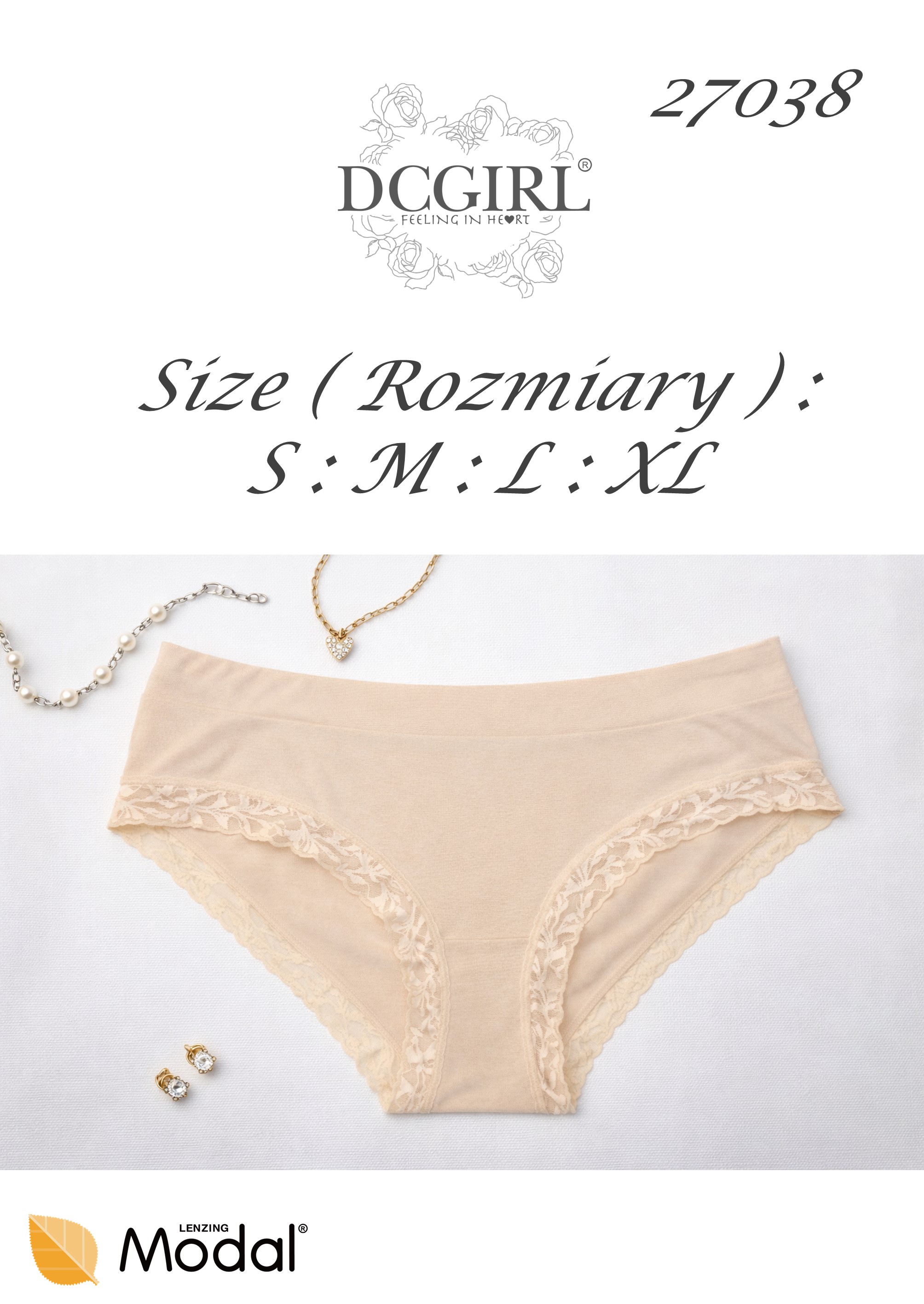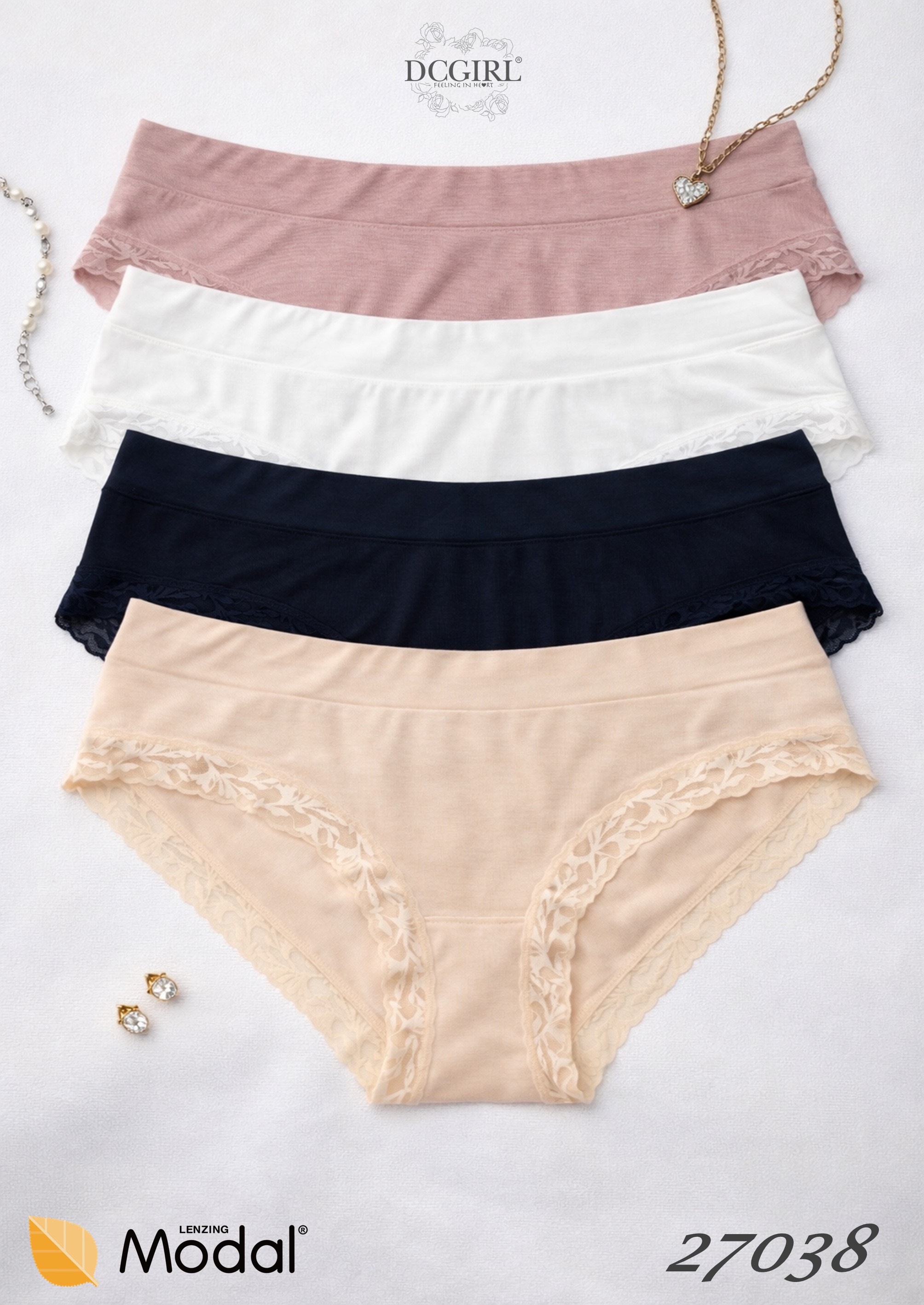 Жіночі труси з м'якого, приємного для шкіри модалу, класичного крою та мереживної обробкою по штанинах. Ідеально сидять. Упаковані в упаковки по 12 штук у різних розмірах (S, M, L, XL). Склад: 94% модал, 6% еластан.