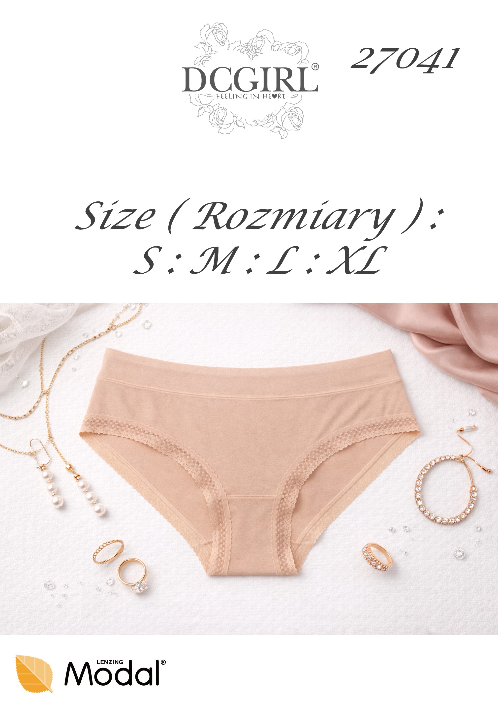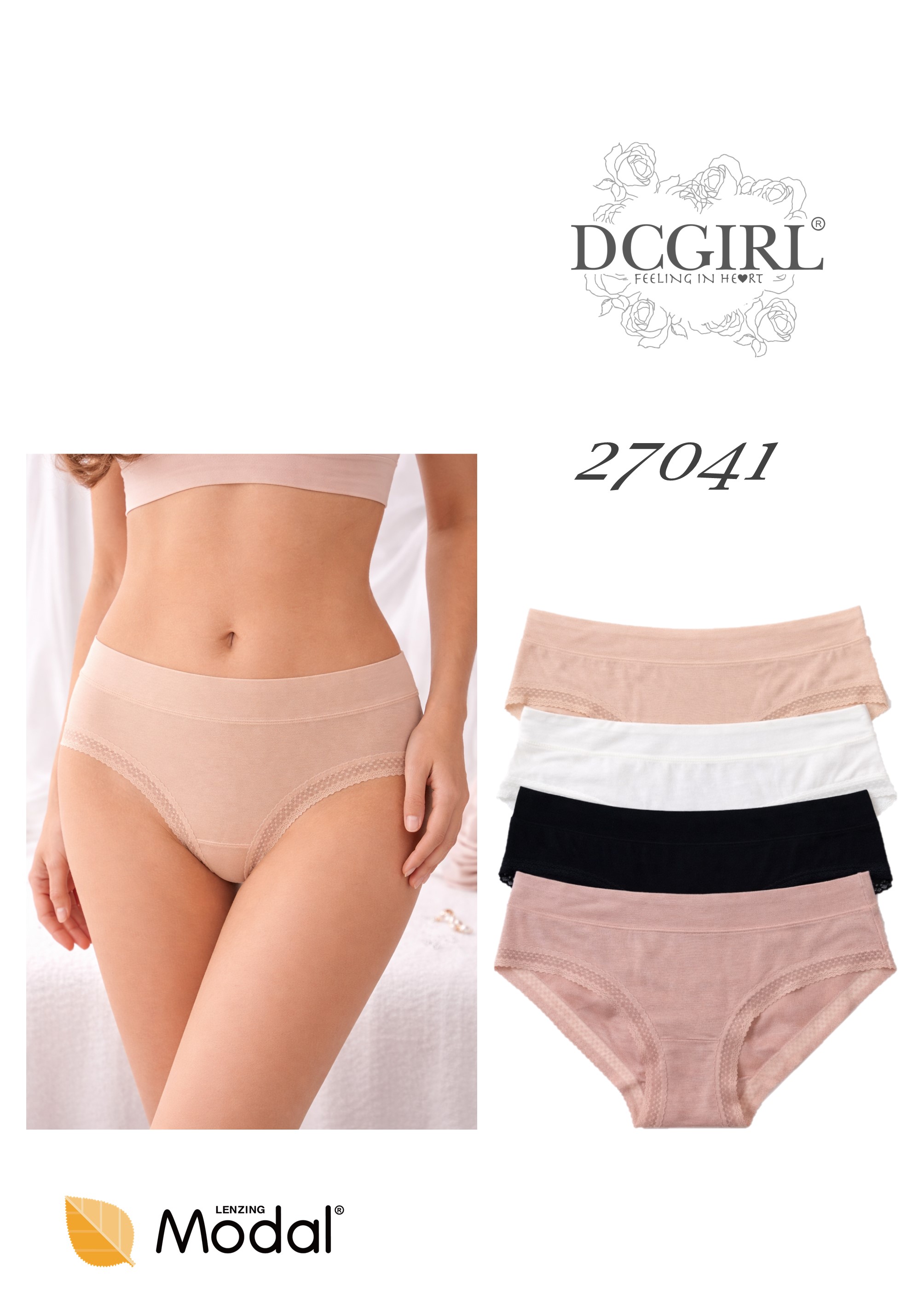 Жіночі труси з м'якого, приємного для шкіри модалу з класичним кроєм та ніжною мереживною обробкою по краях. Ідеально сидять. Упаковані по 12 штук, вони доступні в різних розмірах (S, M, L, XL) та кольорах. Склад: 94% модал, 6% еластан.