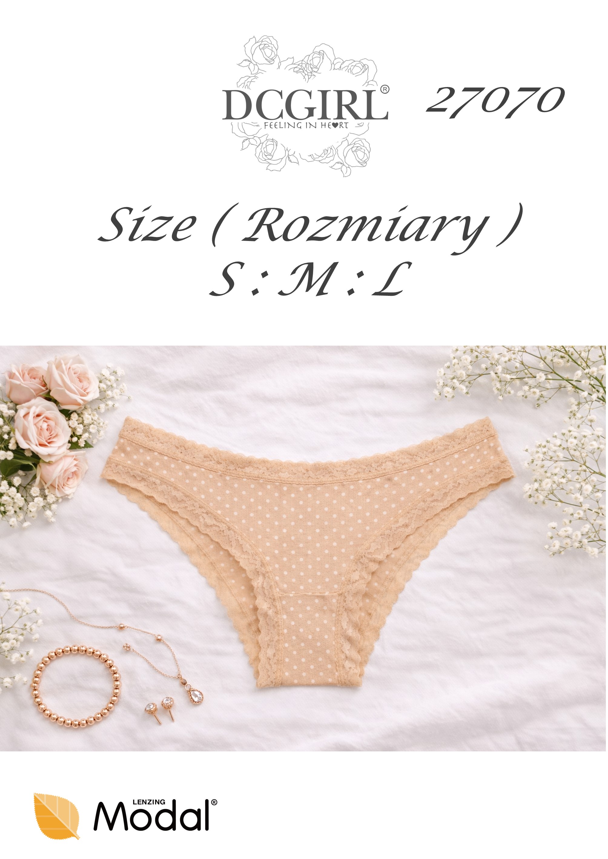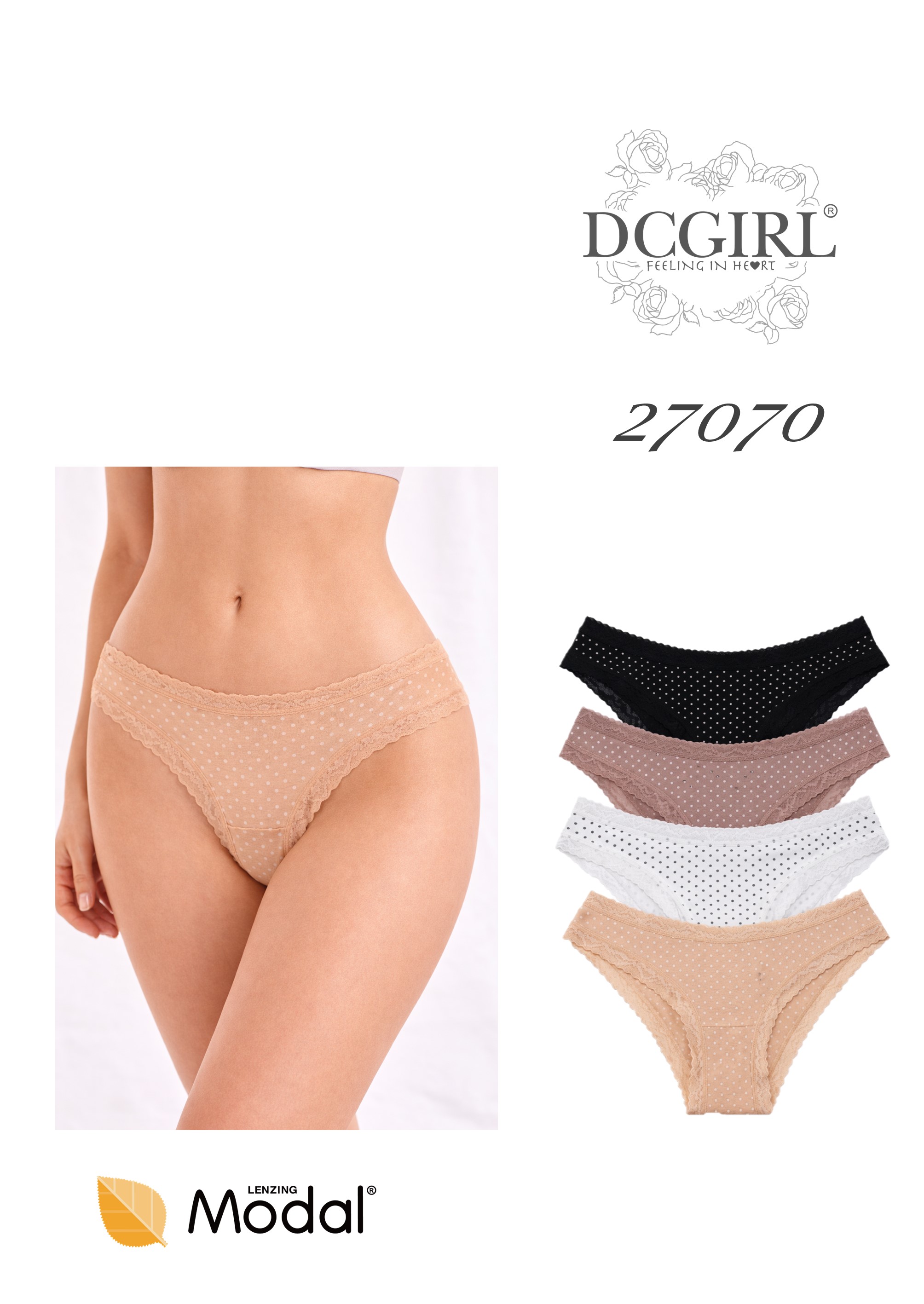 Жіночі трусики в горошок виготовлені з високоякісного, ніжного модалу. Декоровані ніжним мереживом, вони надзвичайно м'які та приємні на дотик. Упаковані в упаковки по 12 штук у міксі кольорів та розмірів (S, M, L). Склад: 94% модал, 6% еластан