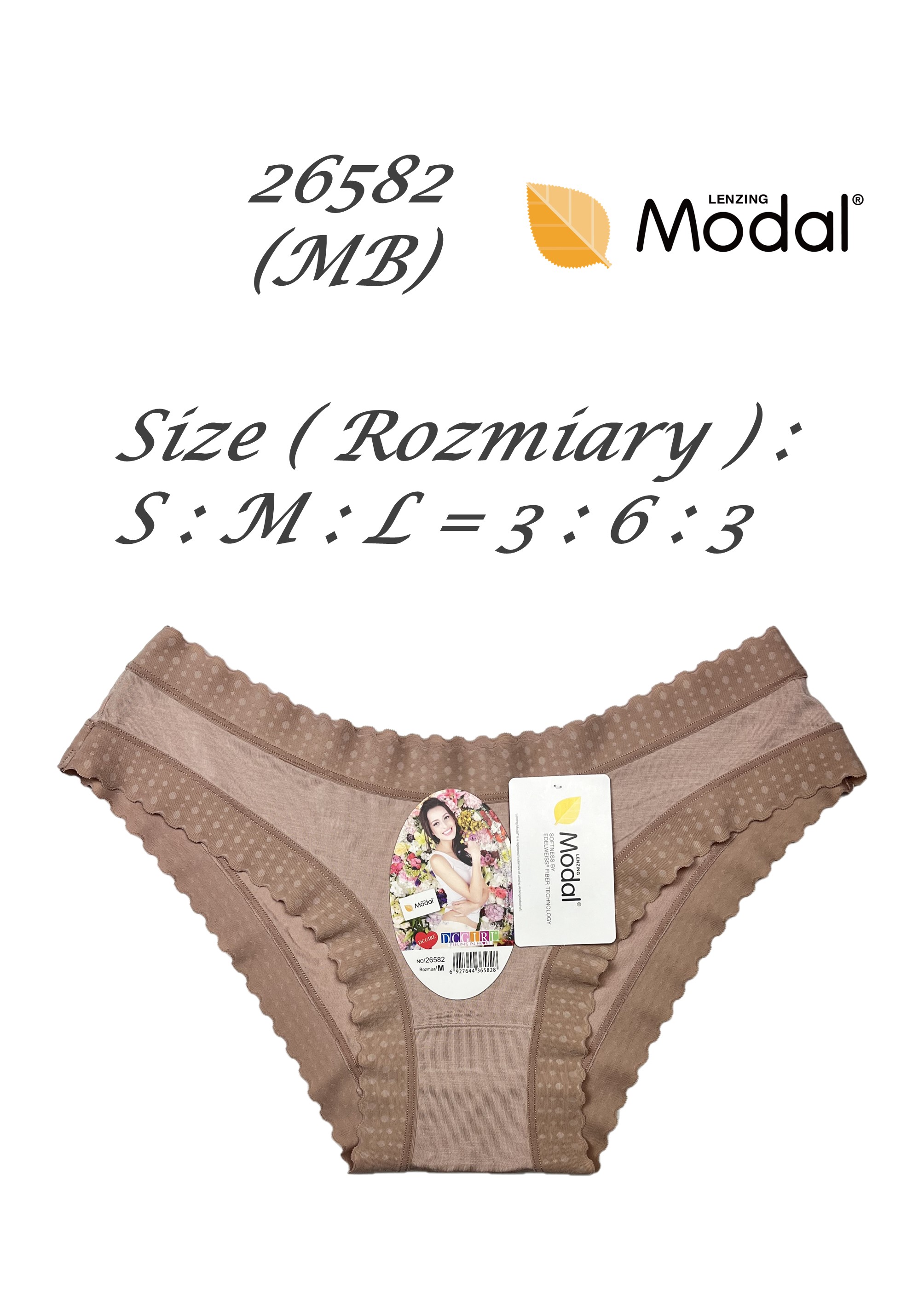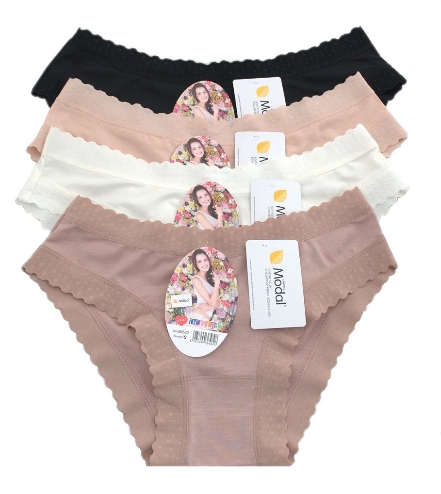 Жіночі труси з високоякісного модалу. Декоровані ніжним мереживом. Надзвичайно м'які та приємні на дотик. Упаковані в упаковки по 12 штук у міксі кольорів та розмірів (S, M, L). Склад: 94% модал, 6% еластан.