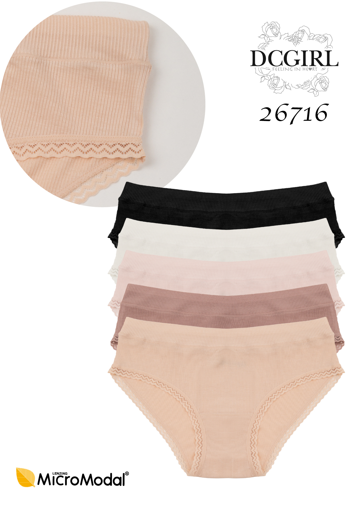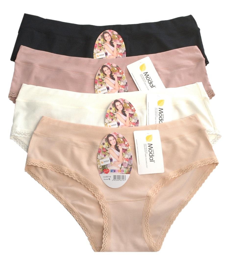 Жіночі труси з ніжного модалу. Вони ідеально прилягають до фігури. Упаковані в упаковках по 12 штук різних кольорів. Кожна упаковка містить мікс розмірів (S, M, L, XL). Склад: 94% модал, 6% еластан.