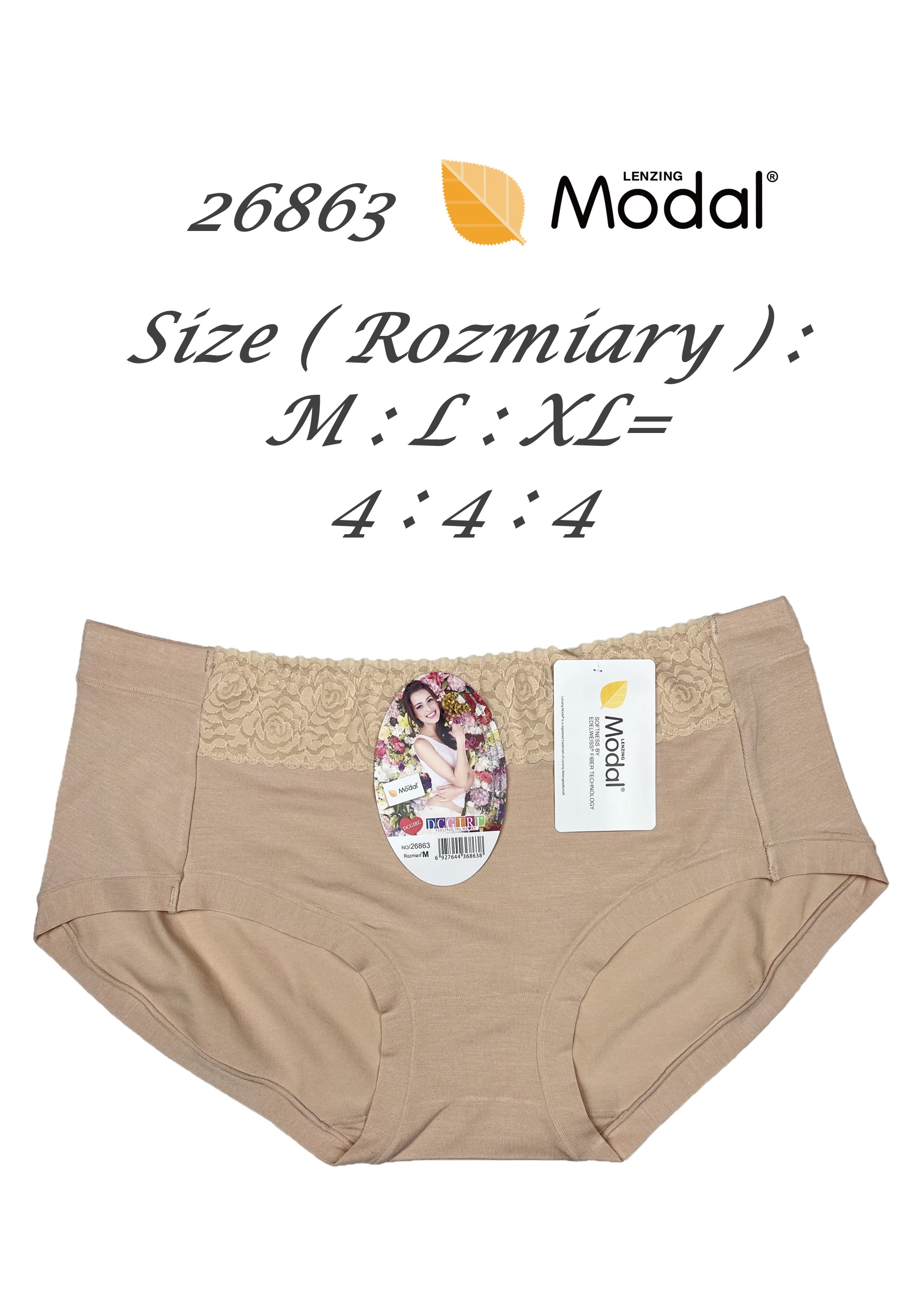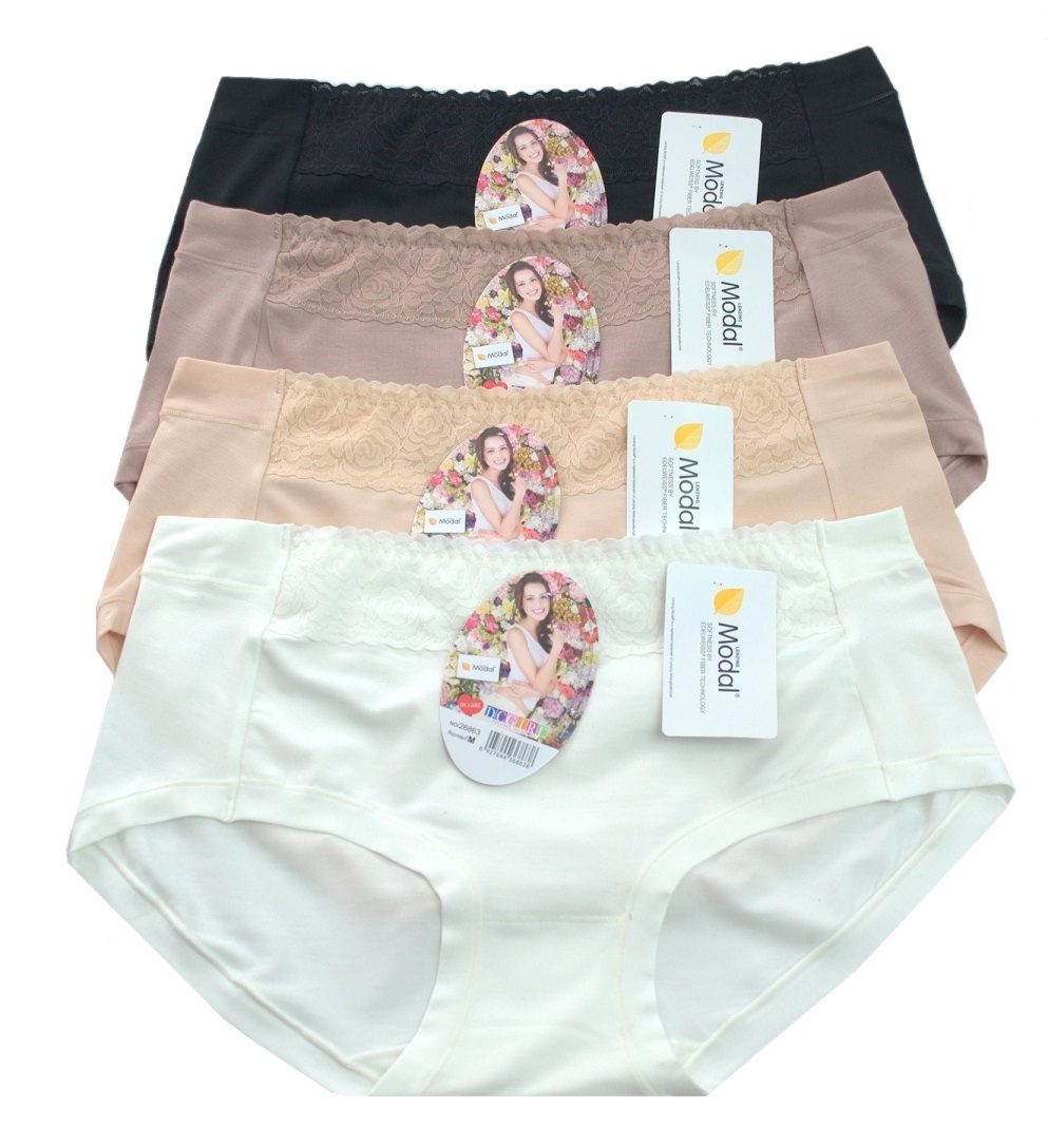 Жіночі труси з м'якого, ніжного модалу. Декоровані ніжним мереживом. Пишні, вбудовані стегна. Упаковані в упаковки по 12 штук у міксі кольорів та розмірів (M, L, XL). Склад: 94% модал, 6% еластан.
