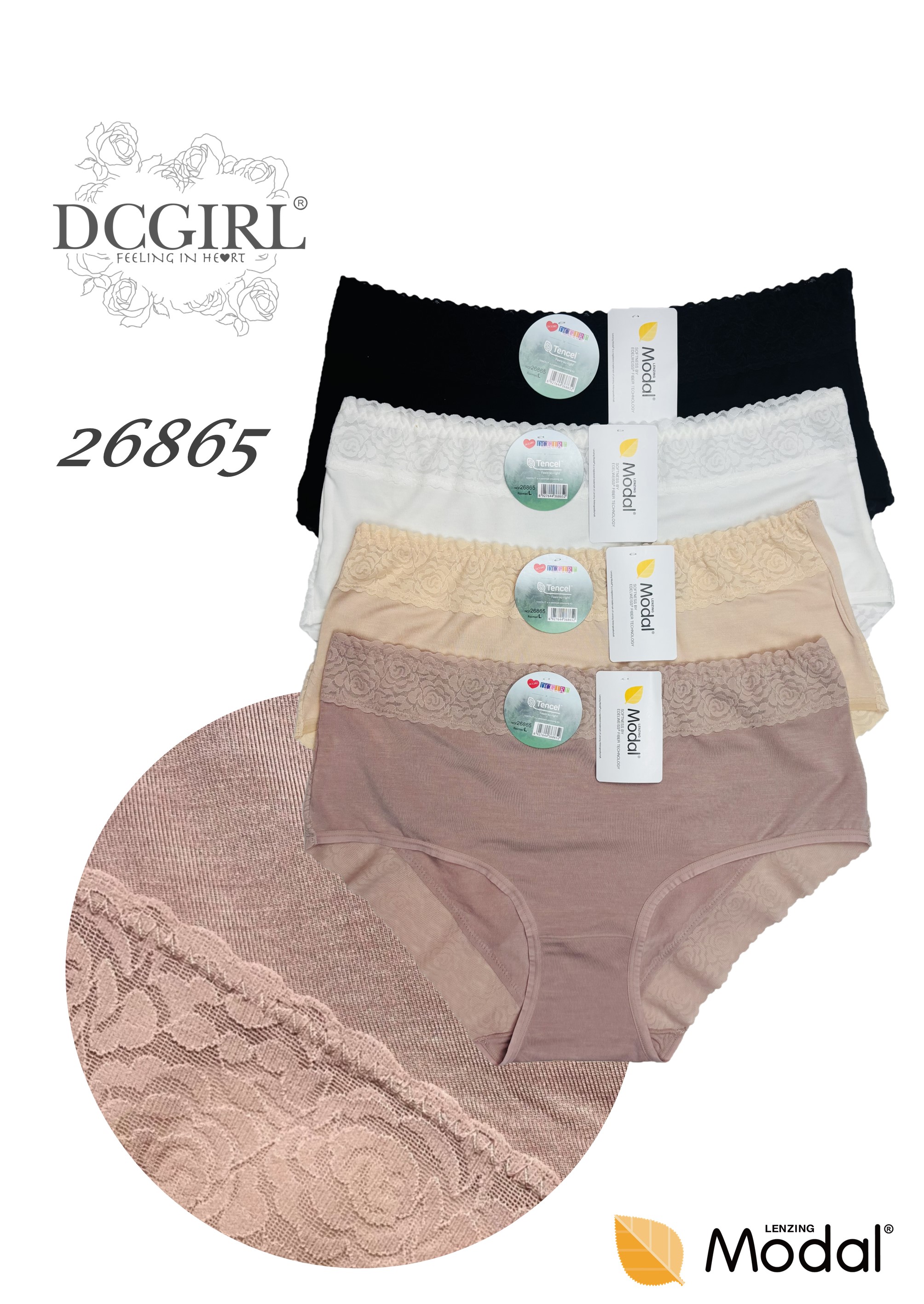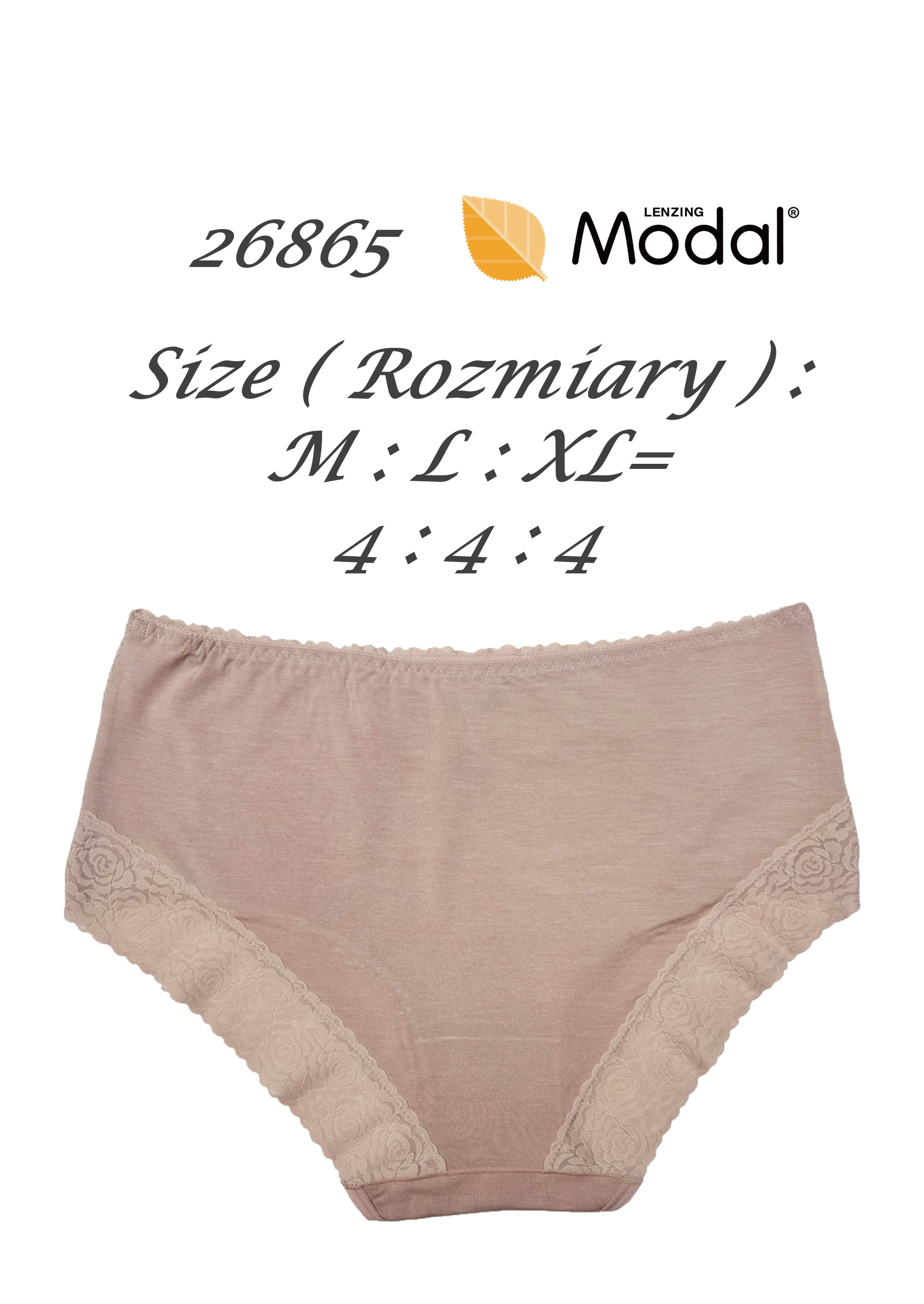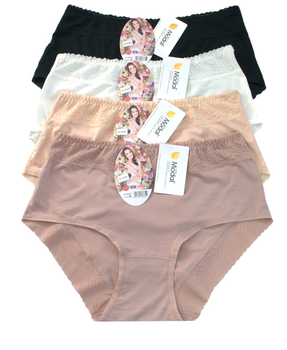 Жіночі пишні труси з високими бортами, оздоблені ніжним мереживом. Виготовлені з дуже м'якого матеріалу. Упаковані в упаковки по 12 штук у міксі кольорів та розмірів (M, L, XL). Склад: 94% модал, 6% еластан.