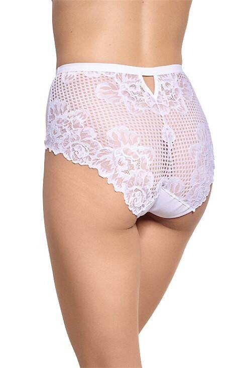 Жіночі труси із завищеною лінією талії та піднятими стегнами. Спереду гладка бавовна, ззаду ажурне мереживо. Склад: 95% бавовна, 5% еластан.