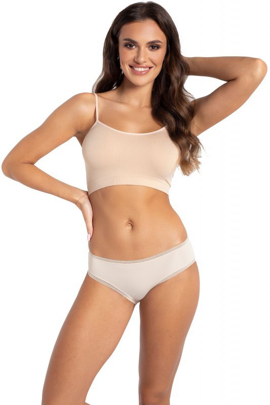 Жіночі трусики з тонкого трикотажу. Краї оброблені ажурною гумкою. Плоскоопрацьовані, без тиску, вони не виділяються під одягом. Склад: 82% поліамід, 18% еластан; мереживо 94% поліамід, 6% еластан.
