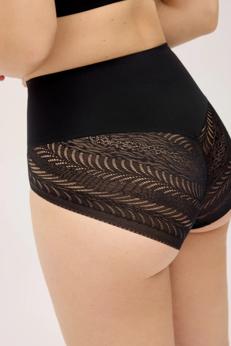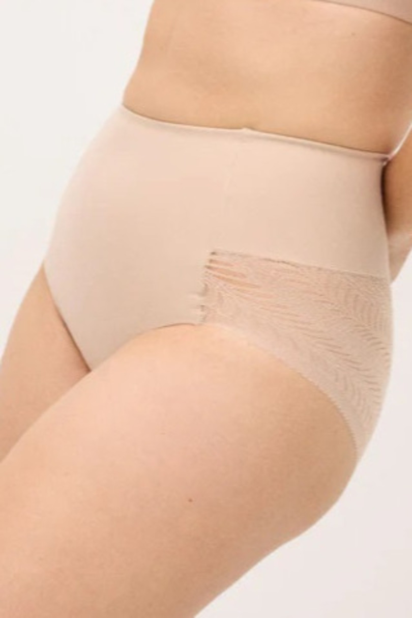 Жіночі коригуючі труси – це зручна коригуюча білизна, яка допомагає дещо стрункішою фігурі та покращити її пропорції. Їхня висока талія делікатно формує живіт, згладжує стегна та забезпечує привабливий вигляд під облягаючим одягом. Виготовлені з м’якого еластичного матеріалу, вони ідеально сидять та забезпечують комфорт протягом усього дня. Ніжні еластичні мереживні вставки додають жіночності, зберігаючи при цьому свою формуючу функцію. Ці труси практичні як для щоденного носіння, так і для особливих випадків – ідеально підходять під сукні, спідниці або облягаючі штани. Їхня гладка конструкція гарантує, що вони залишаються непомітними під одягом. Доступні у двох класичних кольорах: бежевий – ідеально підходить під світлий одяг; чорний – універсальний та елегантний. 77% поліамід, 23% еластан