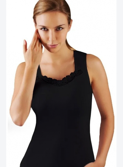 Жіноча футболка з м'якої бавовни на широких лямках. Горловина прикрашена красивою гіпюровою вставкою..