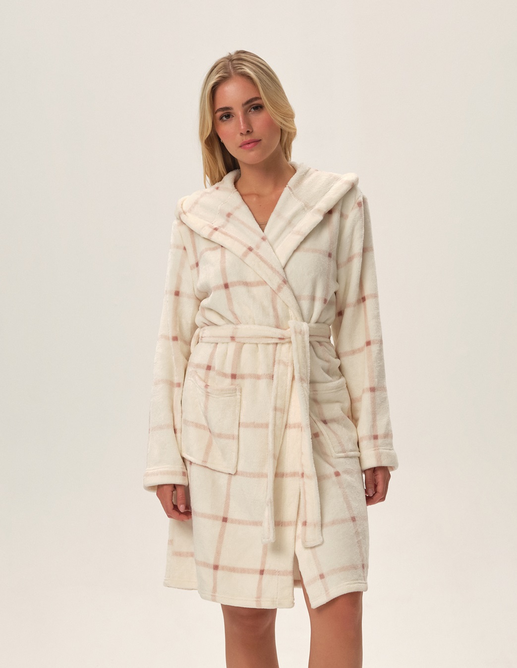 Жіночий халат з капюшоном. Довгі рукави, зав'язуються на талії, дві зовнішні кишені, довжина до коліна. Склад: 100% поліестер