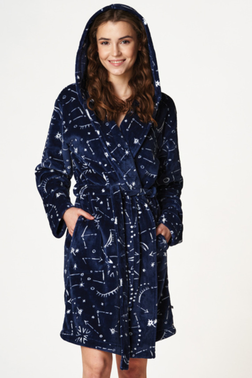 Жіночий короткий халат з капюшоном з малюнком. Зав'язується на талії, зручні кишені на рівні стегон. Склад: 100% поліестер.