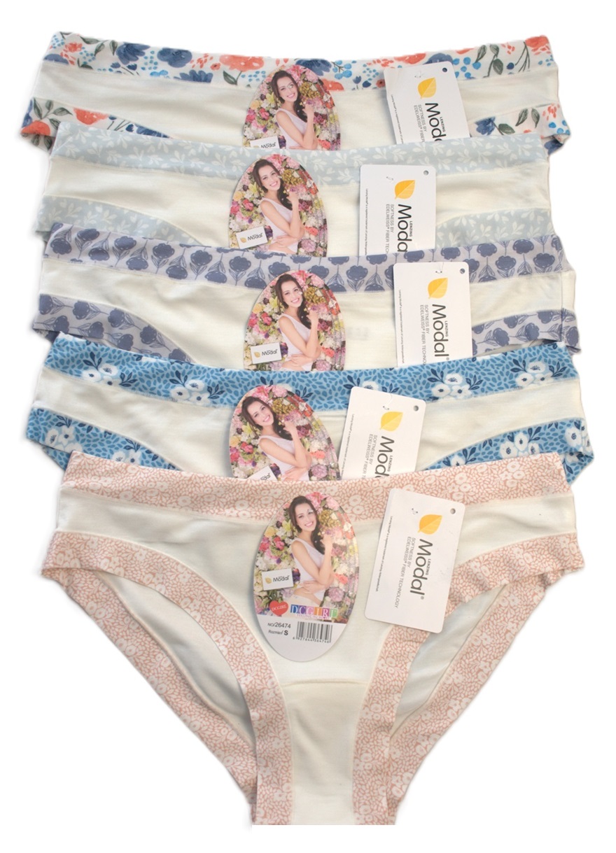 Жіночі трусики з делікатного модалу. Ідеально облягає тіло. 12 штук у поєднанні дизайну та кольорів. Пакет включає різноманітні розміри (S, M, L, XL). Склад: 94% модальний, 6% еластан.
