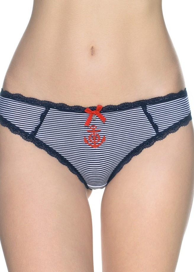 Жіночі міні-бікіні-труси (низька талія, вузькі боки), в модному матроському стилі. Оздоблений декоративним мереживом. Контрастний червоний бант з кулоном на талії. Упакований у коробку з двох (з великим якорем та маленькими якорями).