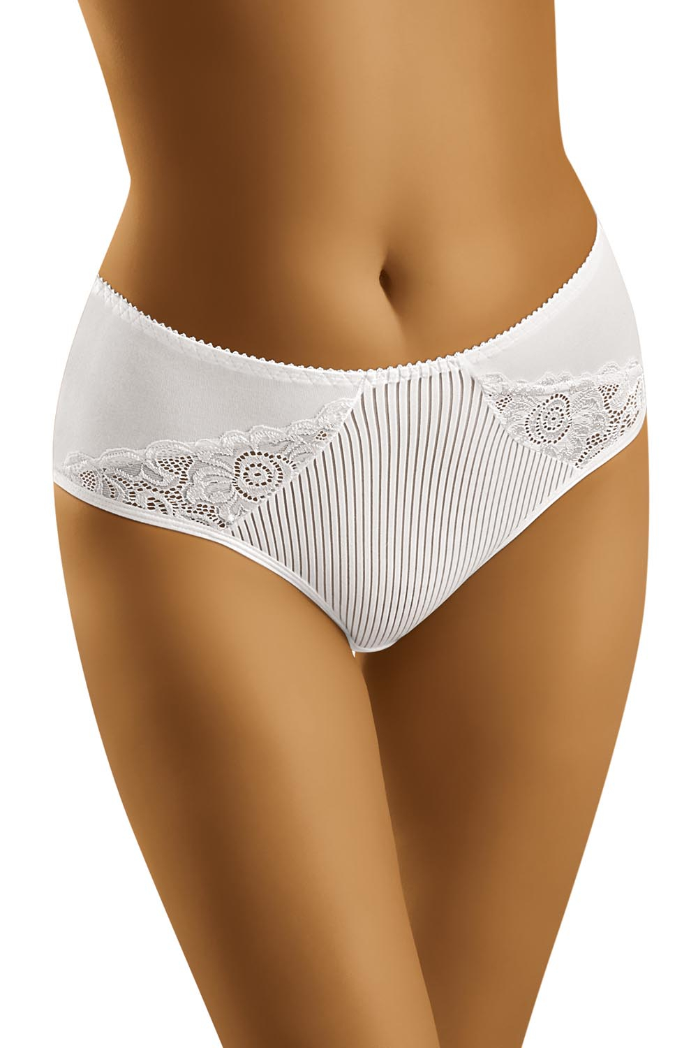 Елегантні бавовняні трусики. Модель з більш високою талією, прикрашена смугами спереду. Боки прикрашені мереживними вставками. Гладка спина. Склад: 90% бавовна, 7% еластан, 3% поліамід.