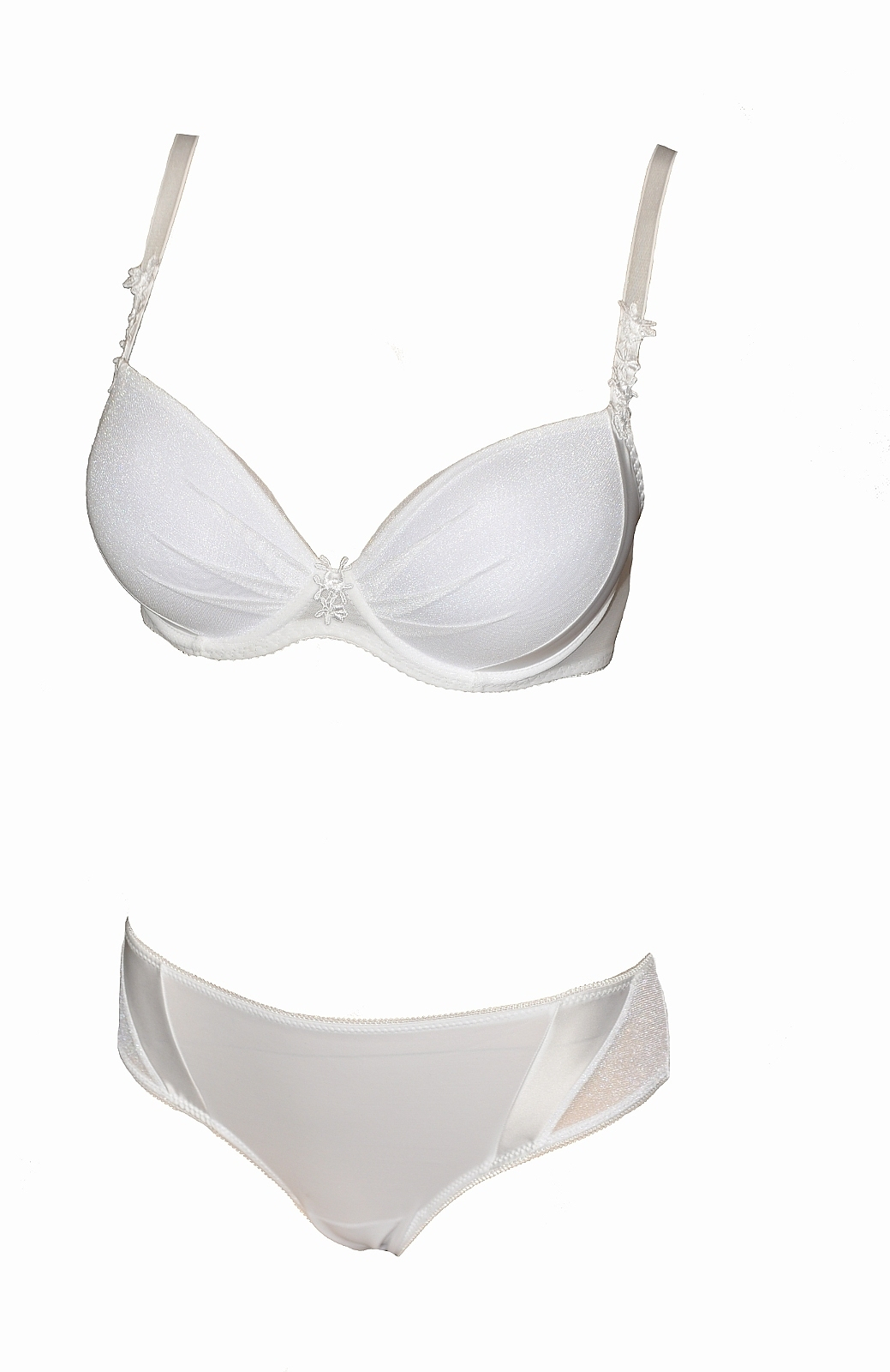 Бюстгальтер push-up з термопрофільованими чашками. Гладкі чашки з ніжними воланами та блискучими атласними вставками. Ремінці та сполучні чашки прикрашені вражаючим гіпюром. Боки гладкі, з еластичної сітки.
