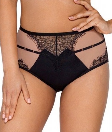 Високі жіночі труси-бразилі, спереду з прозорої сітки, прикрашені мереживною вставкою та смужками. Спинка з однотонної тканини та подвійного тюлю. Склад: 91% поліамід, 5% бавовна, 4% еластан.