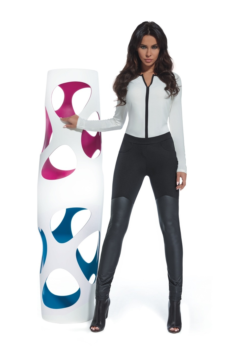 Легінси класичного крою, що імітують штани. Виготовлений з еластичного матеріалу. Оригінальні вставки зі штучної шкіри додають характеру гетрам. Матеріал повністю непрозорий, гнучкий та має форму тіла. Склад матеріалу: 85% поліестер, 15% еластан.