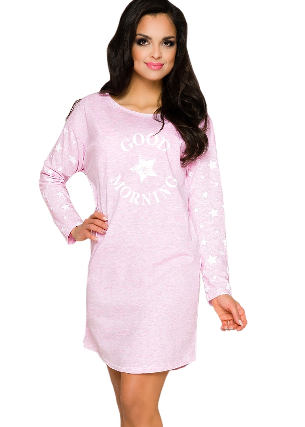 Нічна сукня з високоякісного бавовни, з декоративним принтом спереду та на рукавах. Довжина вище коліна. Склад: 92% бавовна, 8% поліестер.