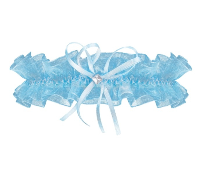 Витончена блакитна підв’язка з двох шарів тюлю, прикрашена бантом в тон і кришталевим люверсом. Нижня сторона оброблена силіконовою смужкою, яка не дасть їй зісковзнути зі стегна. Склад: 100% поліестер.